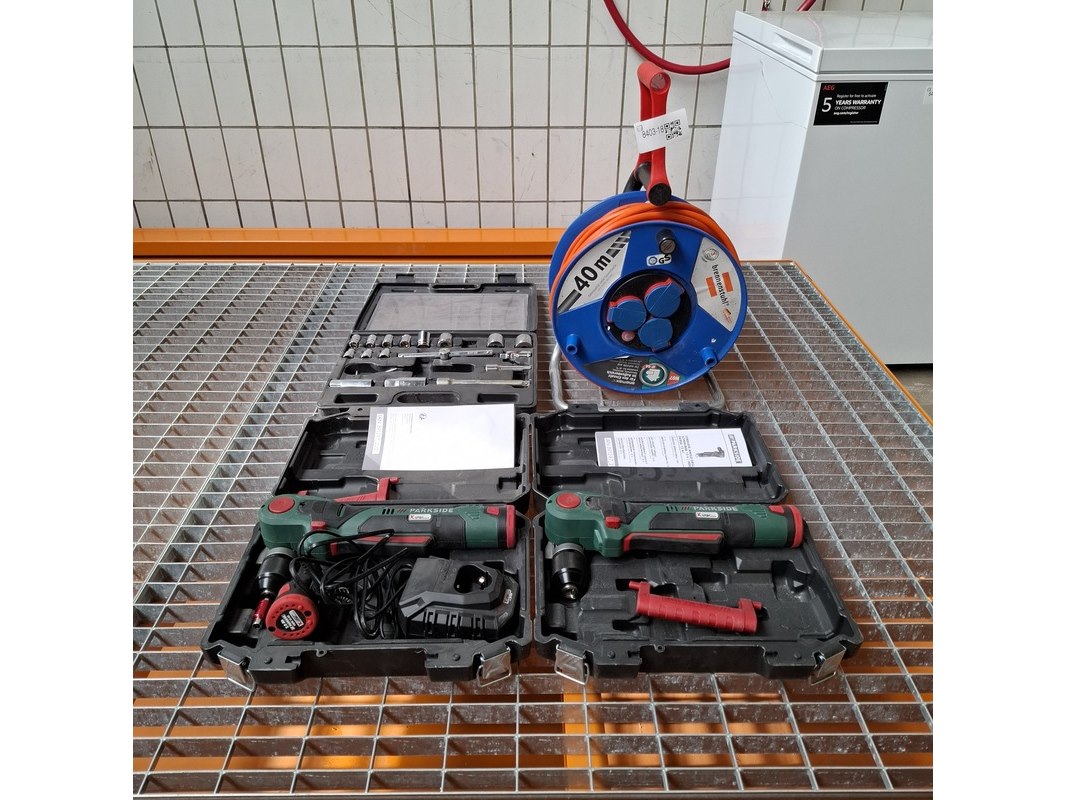 Merk: o.a. Parkside Product: Diverse elektrisch handgereedschap Specificaties: bestaande uit: o.a. kabelhaspel ca 40mtr Brennenstuhl, 2x haakse accuschroefmachine Parkside PBWA12 A1 12V met 3x accu en lader, dopset incompleet