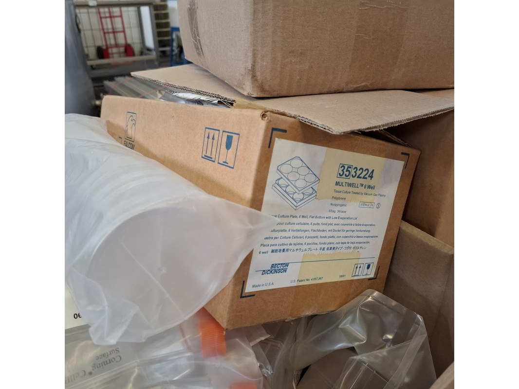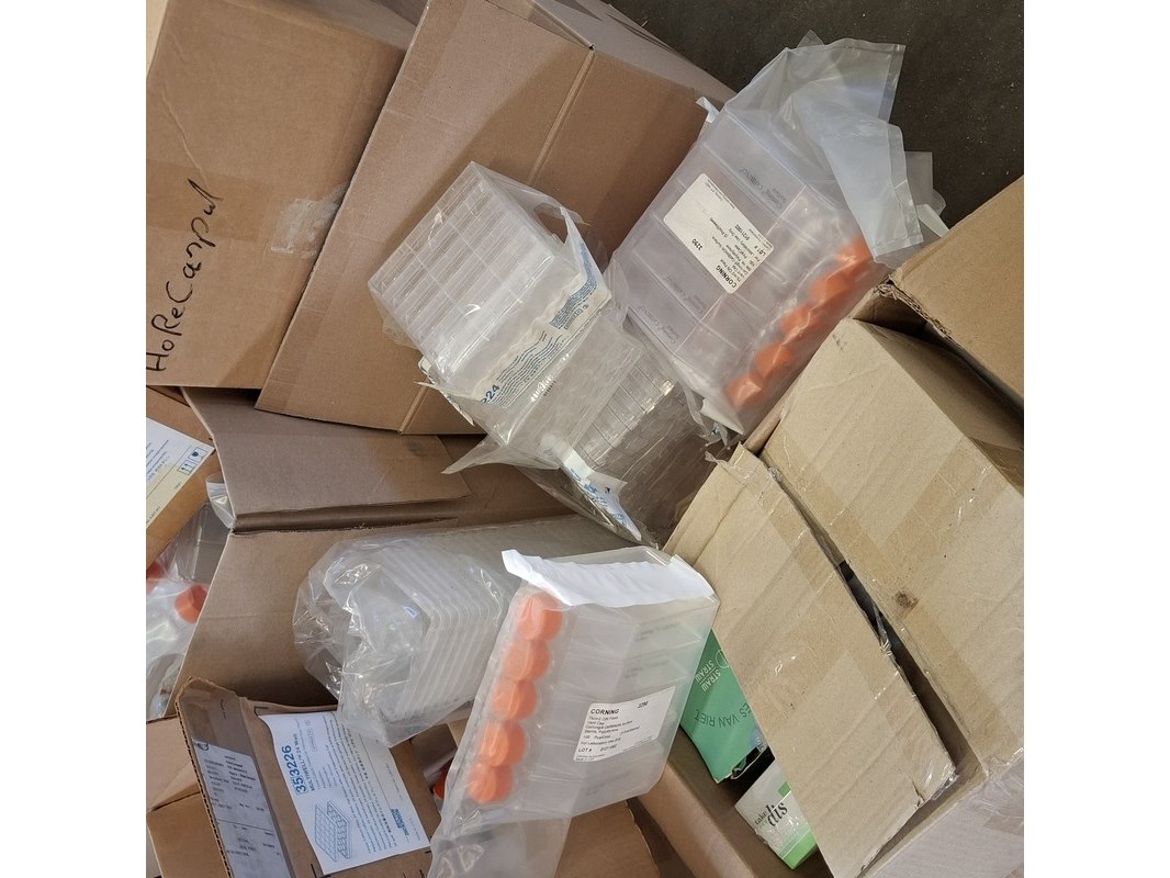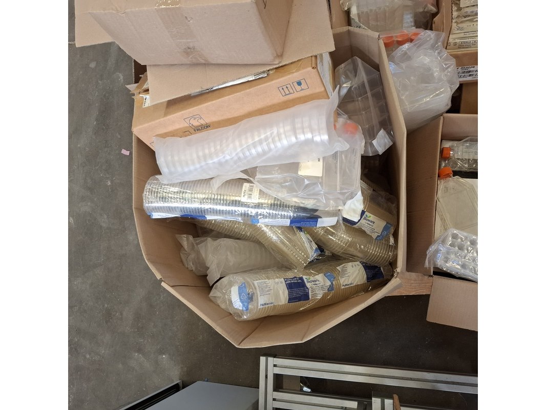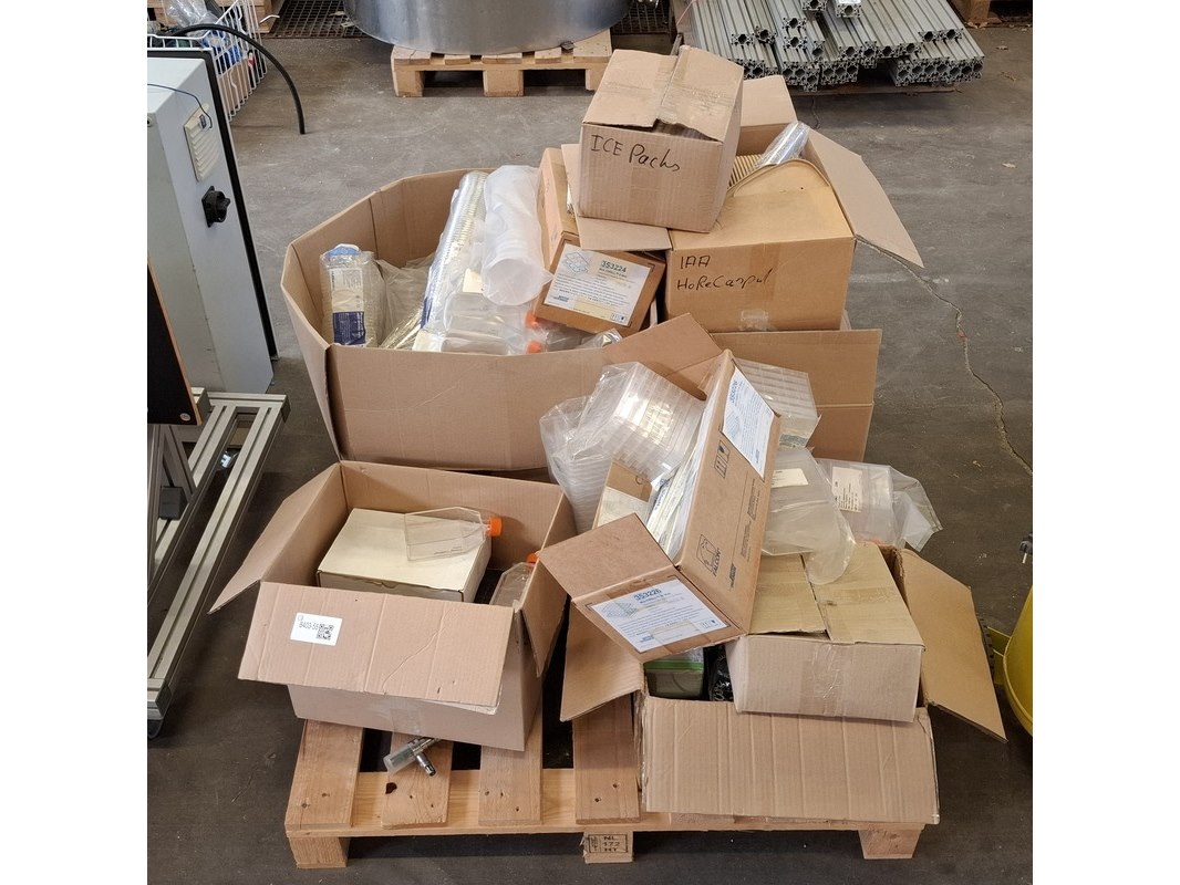 Product: Partij laboratorium benodigdheden Specificaties: bestaande uit: o.a. kunststof bekers, bakjes, storage tubes, pipetten, ice-packs, flesjes, deksels, etc.