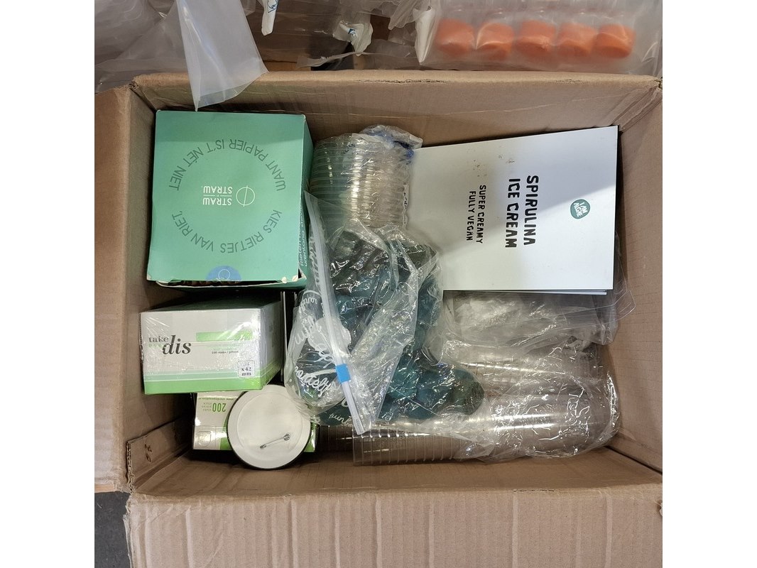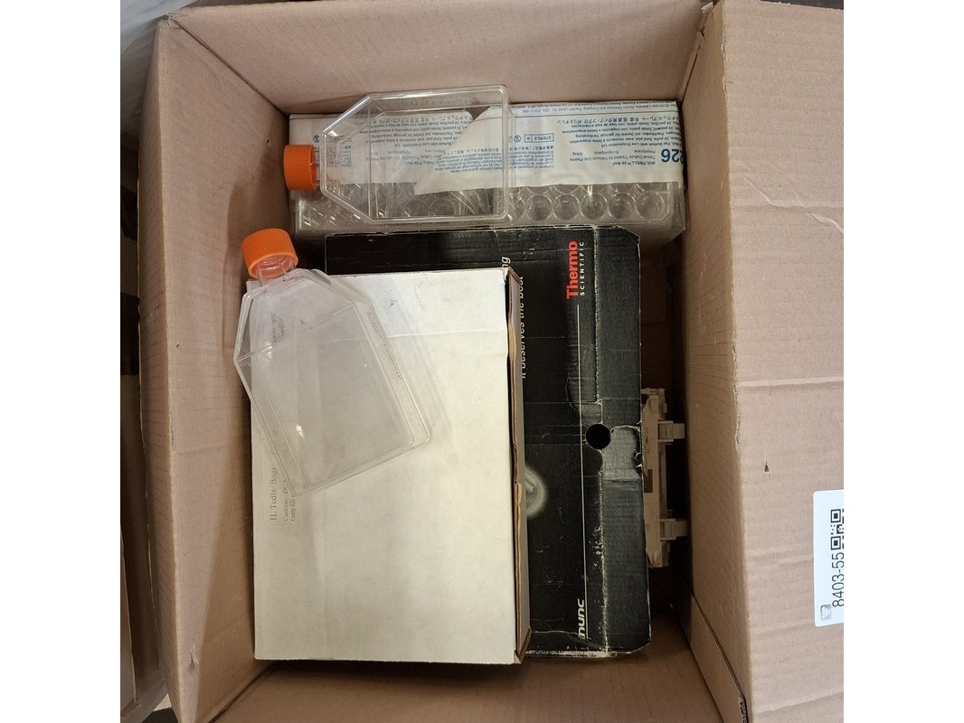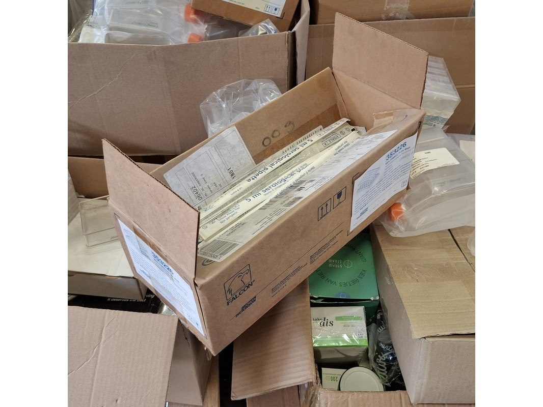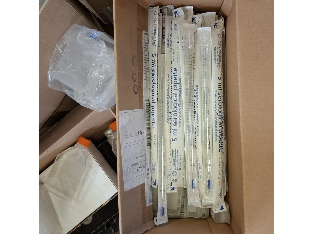 Product: Partij laboratorium benodigdheden Specificaties: bestaande uit: o.a. kunststof bekers, bakjes, storage tubes, pipetten, ice-packs, flesjes, deksels, etc.