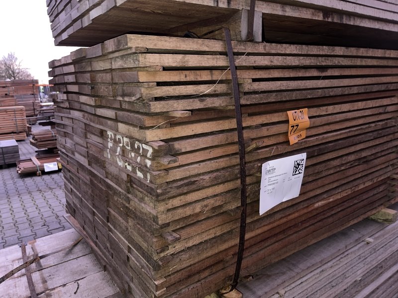 Product: Guyana Teak beschoeiingsplanken Materiaal: Basralocus Afmeting: 22x150mm, lengte 250cm Conditie: nieuw Specificaties: Bezorging in Nederland (m.u.v. de Waddeneilanden). Bezorging vindt plaats binnen 15 werkdagen na de betalingsdeadline, mits de betaling tijdig bij ons binnen is. Bezorgkosten bedragen € 99,- ex. btw per kavel en worden als handelingskosten weergegeven op de aankoopfactuur. De goederen worden bezorgd op het adres op de aankoopfactuur. Zorg dus dat de gegevens voor sluiting van de veiling correct in jouw account staan.