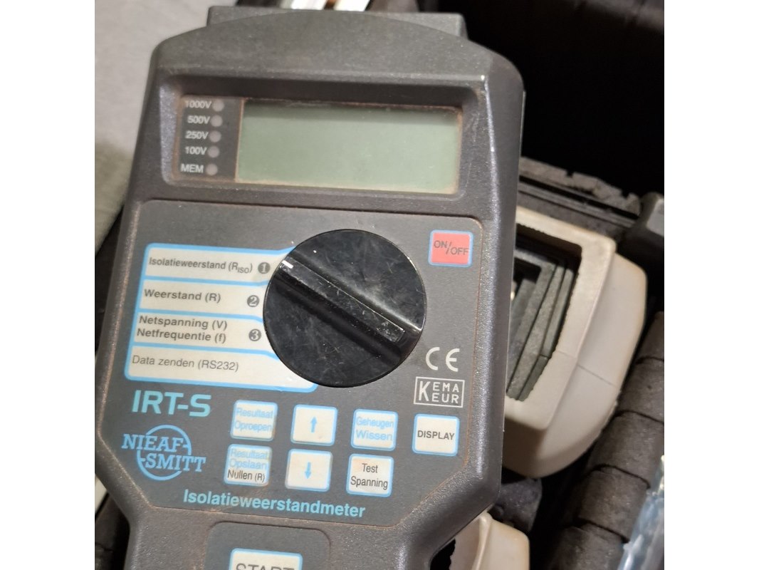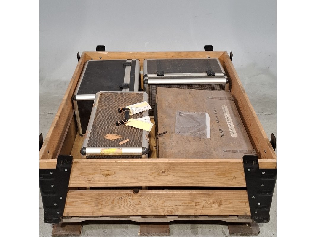 Merk: o.a Nieaf Product: Diverse meetapparatuur en 2x houten transportkist Afmeting: Diverse maten Conditie: gebruikt Specificaties: Bestaande uit 3x koffer met diverse meetinstrumenten en 1x transportkist met schuurpads en etc. Technische staat en compleetheid onbekend. Exclusief palletkist