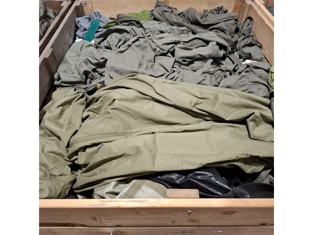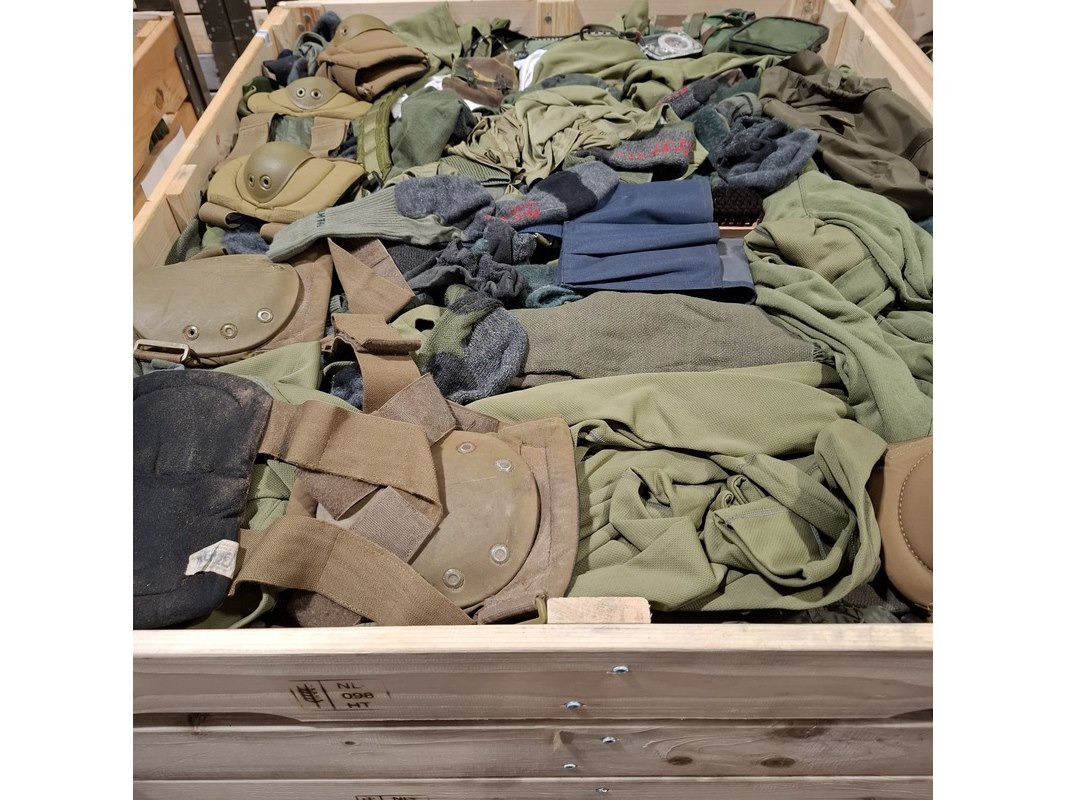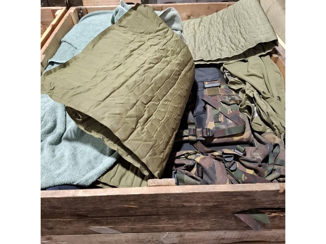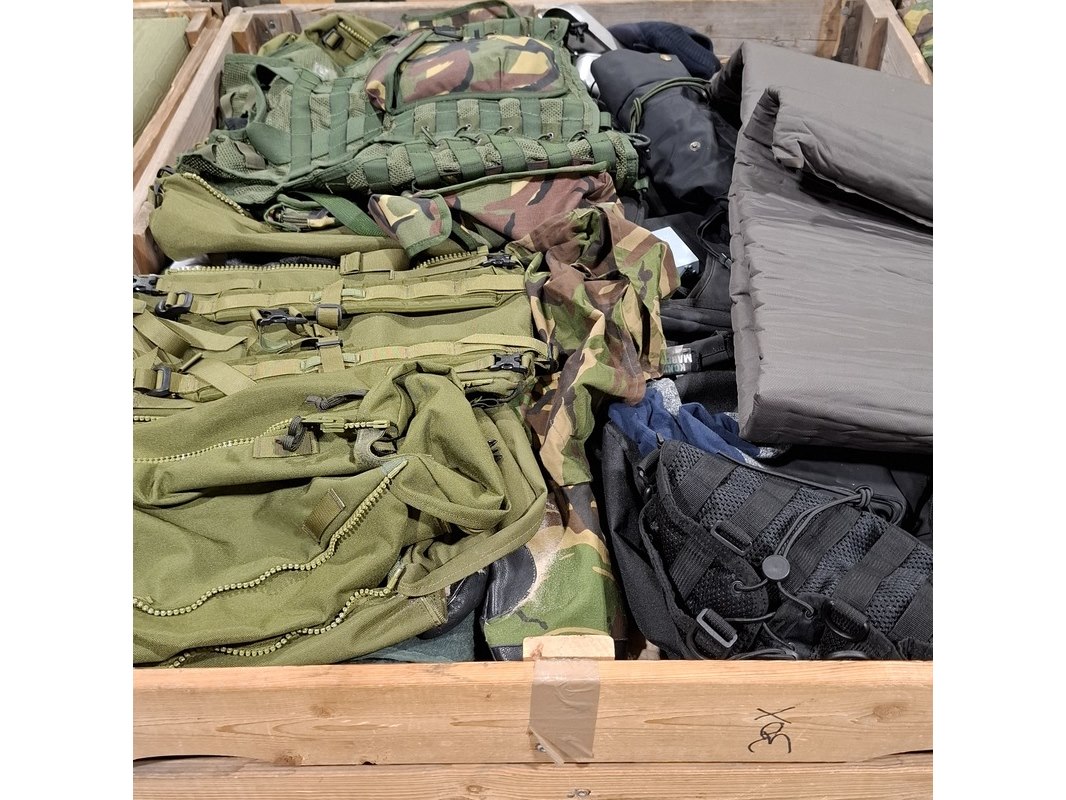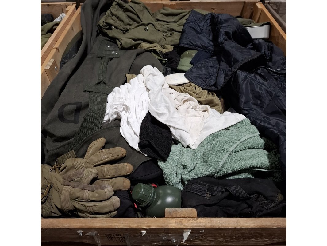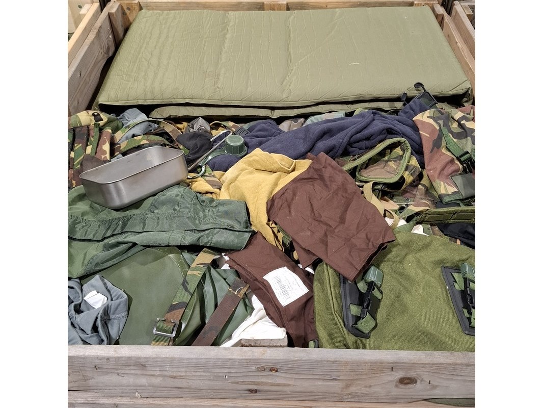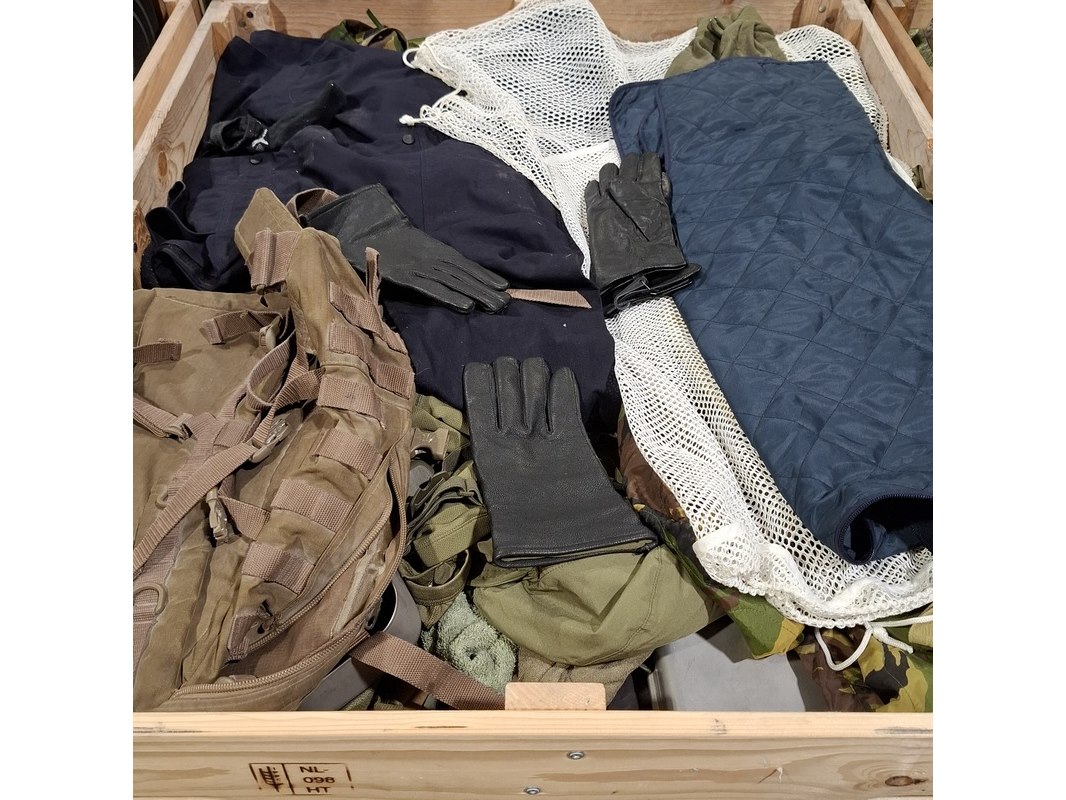Product: Persoonlijke uitrusting en kleding Defensie Afmeting: Diverse maten Conditie: gebruikt Specificaties: Bestaande uit ca. 39x palletbox ongesorteerde artikelen.