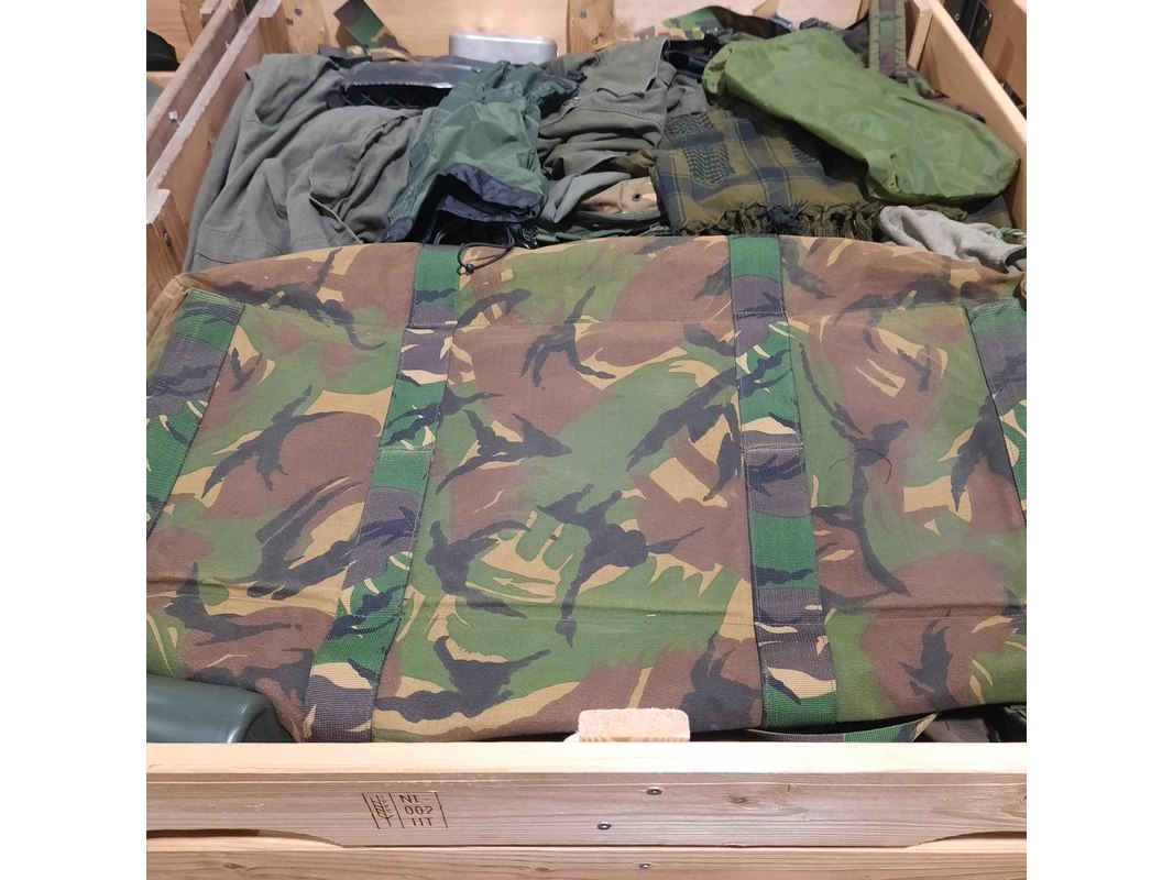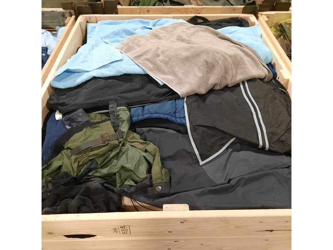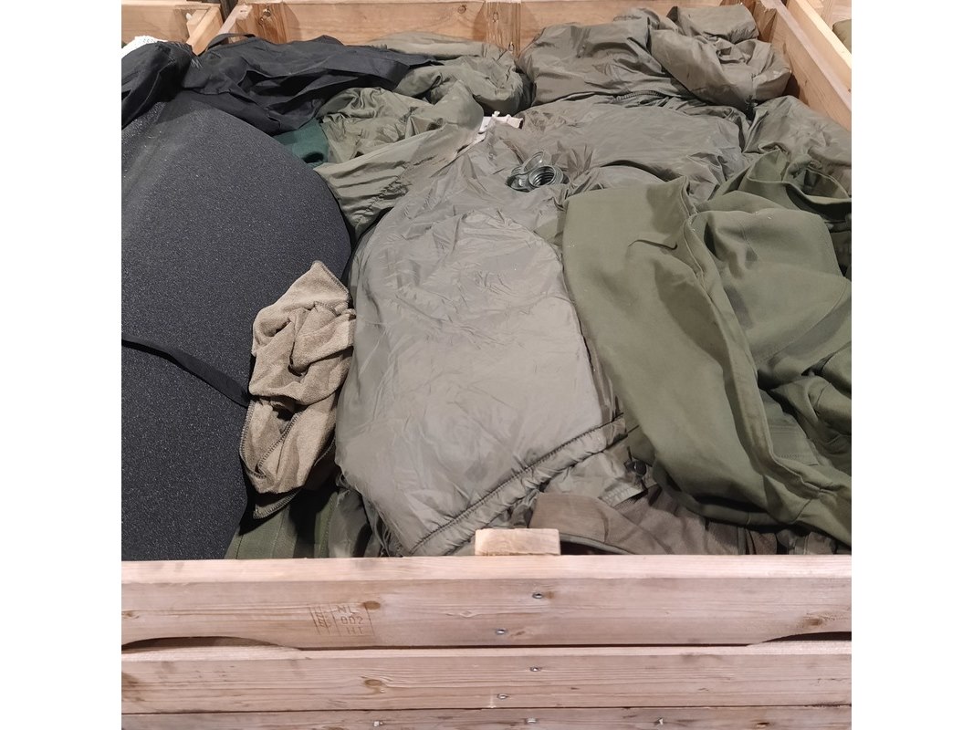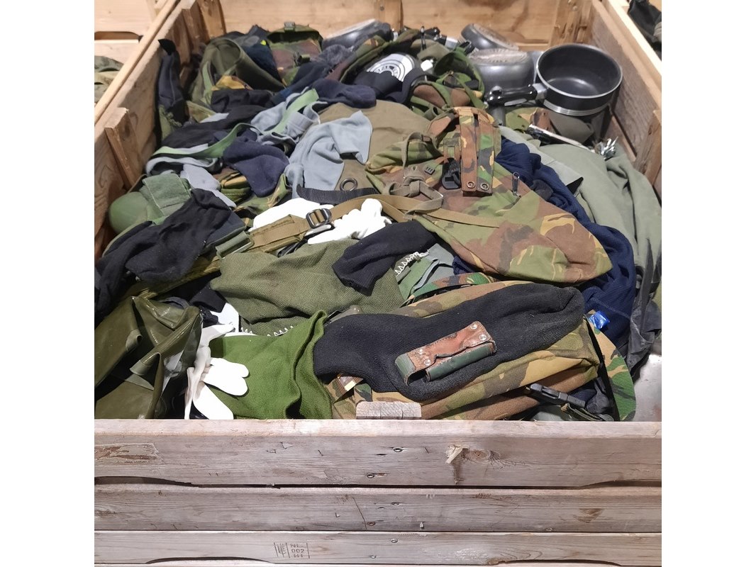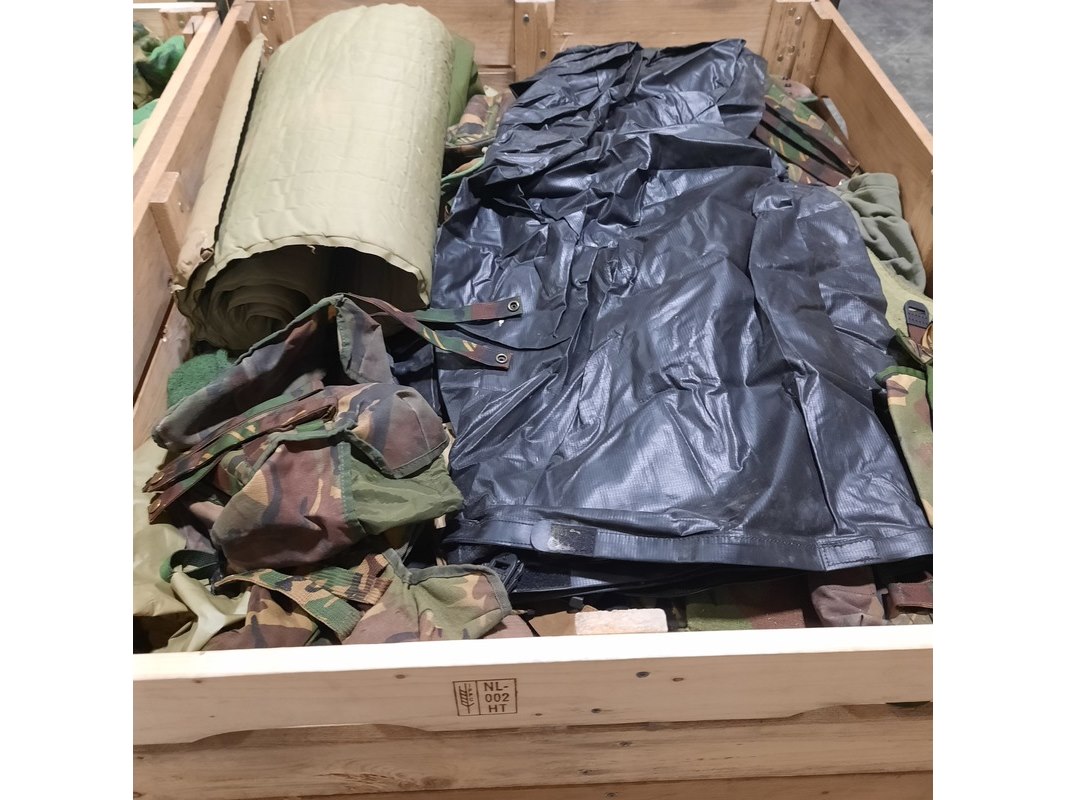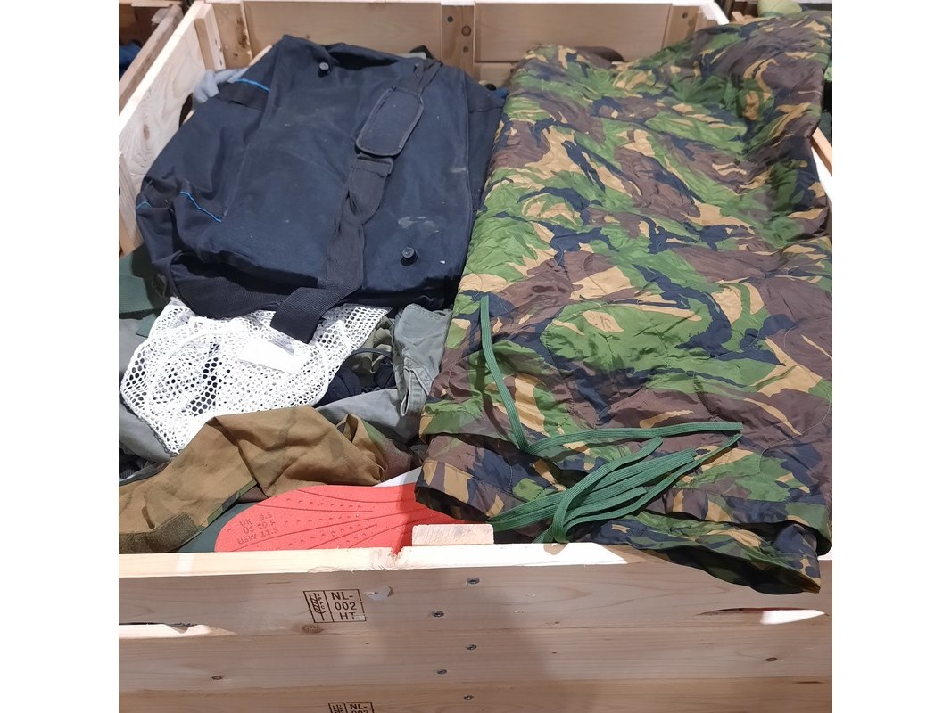 Product: Persoonlijke uitrusting en kleding Defensie Afmeting: Diverse maten Conditie: gebruikt Specificaties: Bestaande uit ca. 38x palletbox ongesorteerde artikelen.