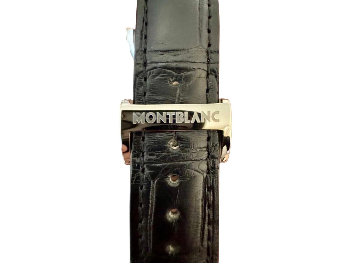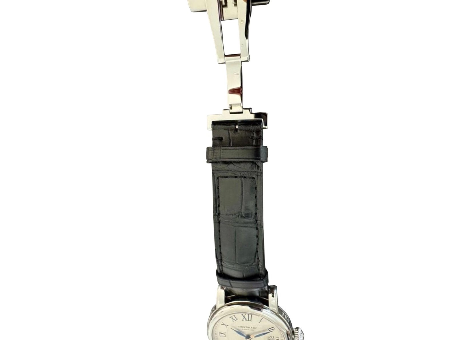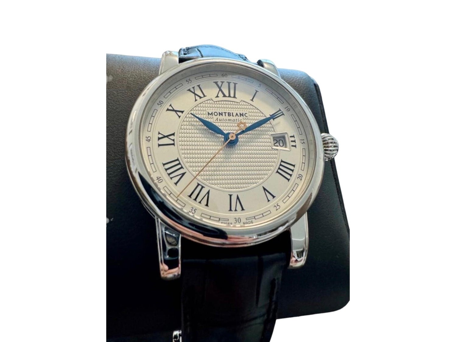 Product: Montblanc Automatic Star Date herenhorloge Afmeting: 39mm Conditie: Gebruikt Specificaties: Inclusief originele doos en papieren. Merk: Montblanc. Productnaam: Star Date. Automatic referentie: 113644. Uurwerk: Automatisch. Kastdiameter: 39mm. Waterdichtheid: 30m. Glas: Saffierglas. Specificaties: Datumaanduiding, 3 wijzers, doorzichtige achterzijde. Kastmateriaal: Roestvrij staal. Bezelmateriaal: Roestvrij Staal. Bandmateriaal: Leer. (originele band, D-sluiting) Wijzerplaatkleur: Zilver. Wijzerplaattype: Guilloché. Accessoires: Originele fabrikantsdoos (inclusief omdoos), Internationaal garantiebewijs.