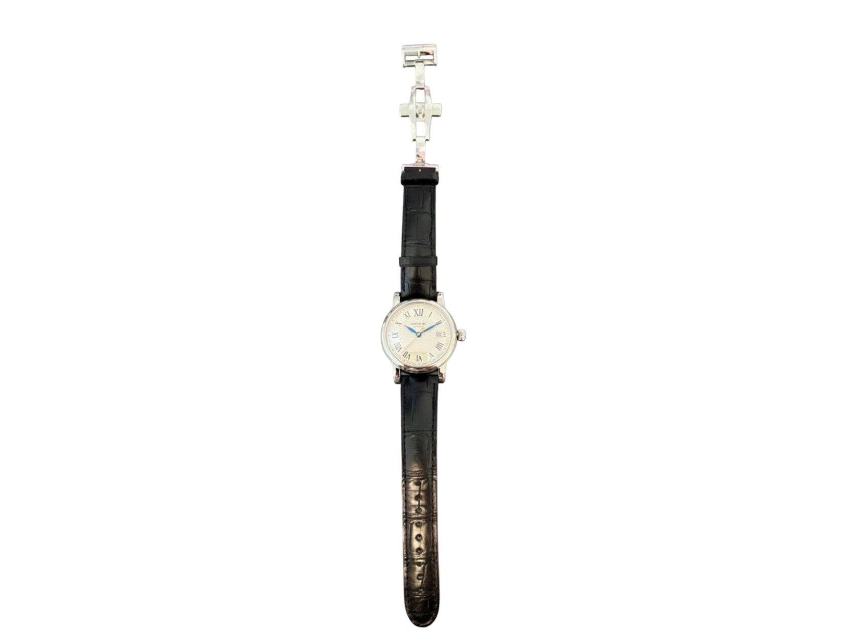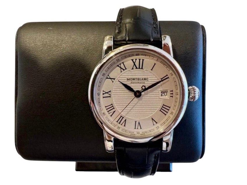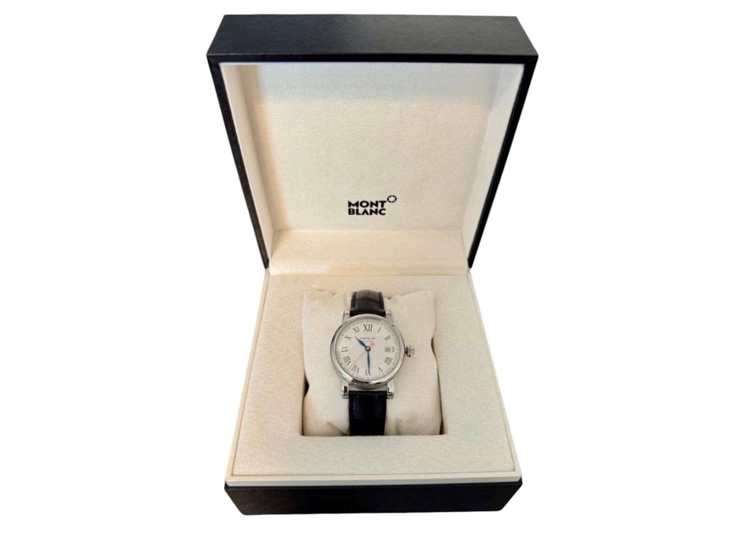 Product: Montblanc Automatic Star Date herenhorloge Afmeting: 39mm Conditie: Gebruikt Specificaties: Inclusief originele doos en papieren. Merk: Montblanc. Productnaam: Star Date. Automatic referentie: 113644. Uurwerk: Automatisch. Kastdiameter: 39mm. Waterdichtheid: 30m. Glas: Saffierglas. Specificaties: Datumaanduiding, 3 wijzers, doorzichtige achterzijde. Kastmateriaal: Roestvrij staal. Bezelmateriaal: Roestvrij Staal. Bandmateriaal: Leer. (originele band, D-sluiting) Wijzerplaatkleur: Zilver. Wijzerplaattype: Guilloché. Accessoires: Originele fabrikantsdoos (inclusief omdoos), Internationaal garantiebewijs.
