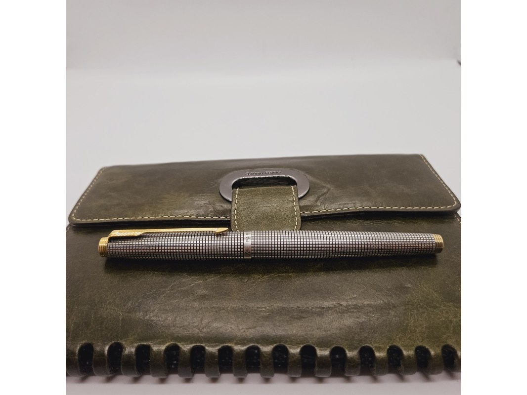 Product: Zilveren Parker 75 Cicele vulpen met 14kt gouden nib Conditie: Gebruikt Specificaties: Merk: Parker. Model: 75 Cicele. Materiaal pen: Sterling zilver met goldplating. Materiaal Nib: 14kt goud. Inclusief leren Claudio Ferrici notitieboek.