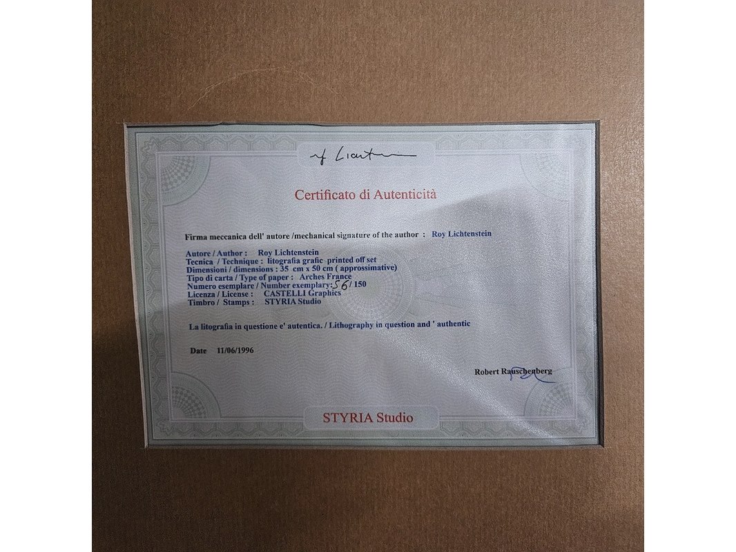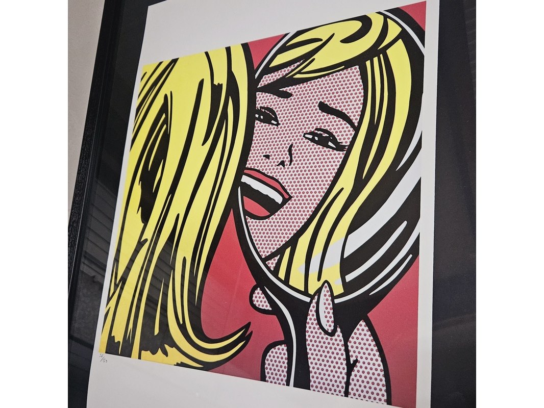 Product: Roy Lichtenstein - ''Girl In Mirror'' Lithograaf Afmeting: 63cm x 48cm Conditie: Nieuw Specificaties: Limited edition 56/150 Uitgever Styria Studio, wordt nieuw ingelijst geleverd met een zwart houten frame.
