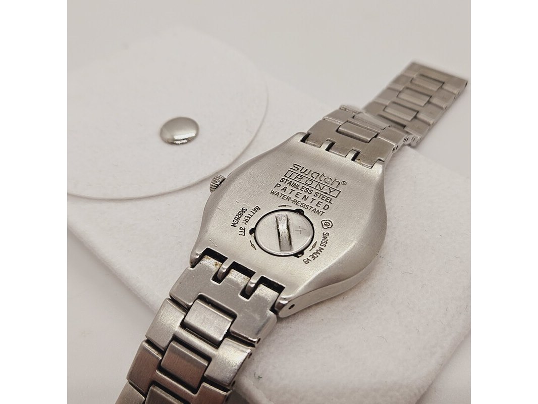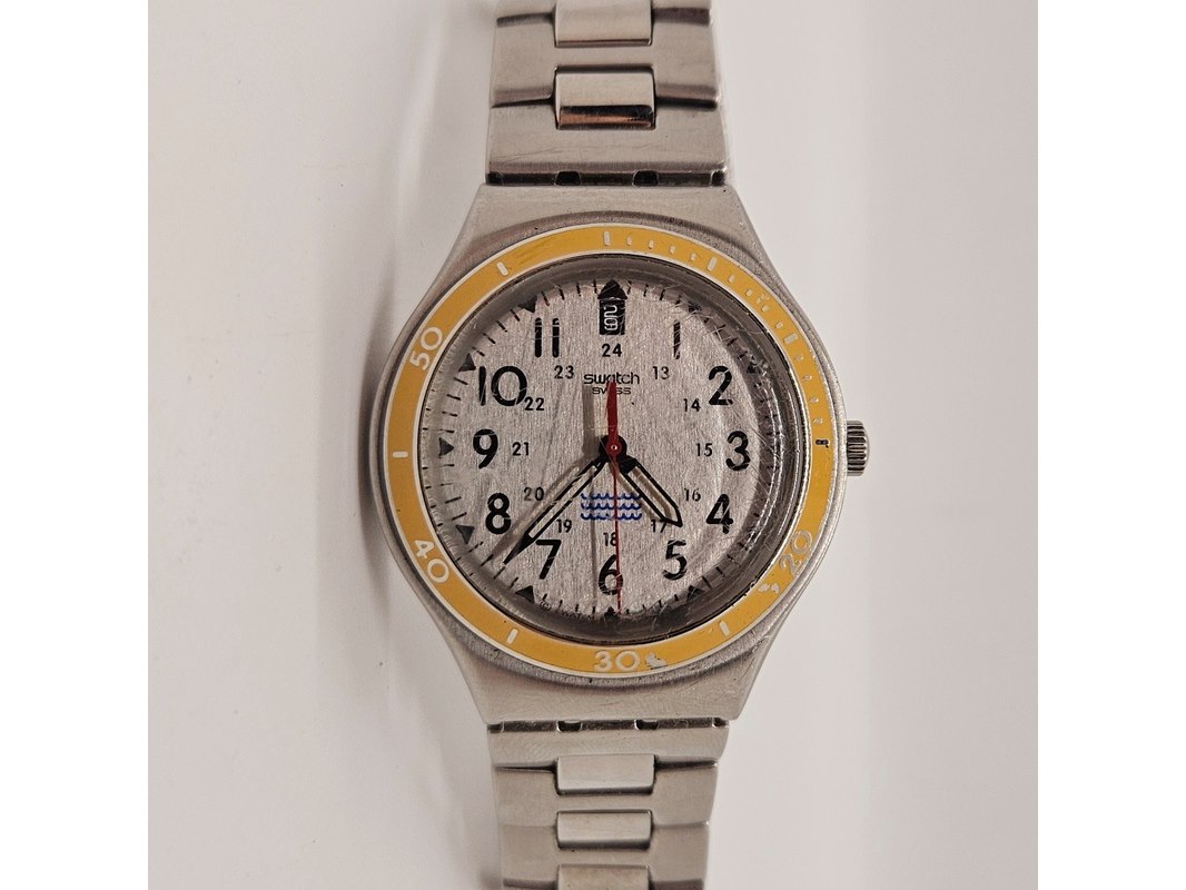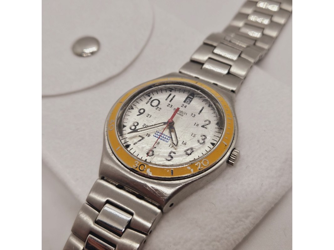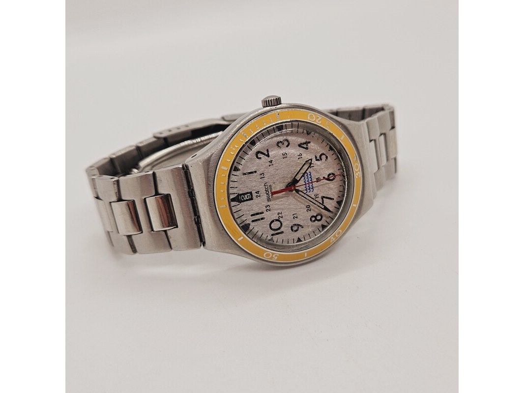Product: Swatch Irony Big Snice herenhorloge Afmeting: 37mm Conditie: Gebruikt Specificaties: Uurwerk loopt goed. Dit betreft een tweedehands item met sporen van gebruik. Incl. etui