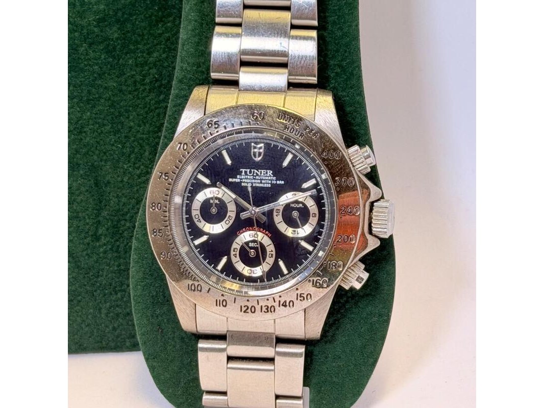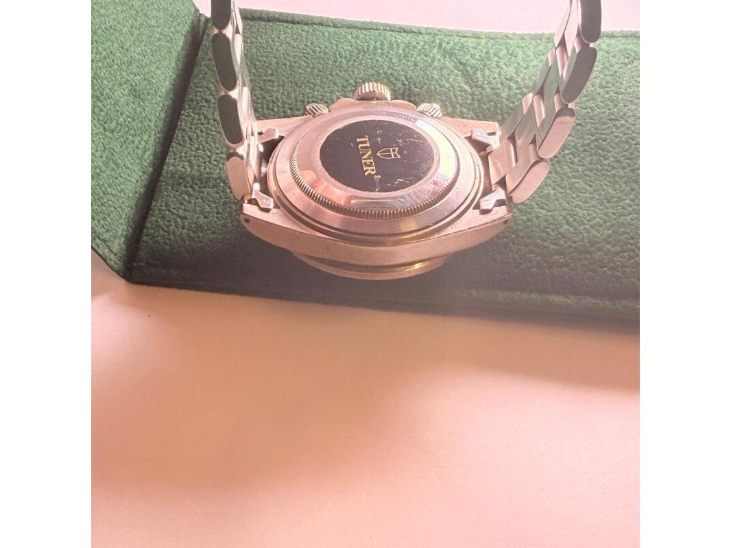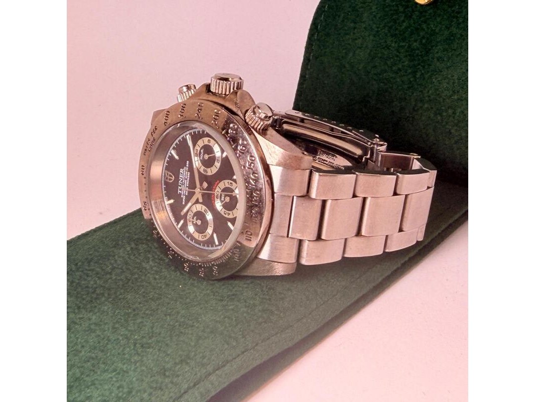 Product: Tuner Chronograph herenhorloge - Homage Daytona model Afmeting: 44mm Conditie: Gebruikt Specificaties: Inclusief juweliers hoes. Werkend getest onder quartz-tester, heeft een nieuw batterijtje nodig.