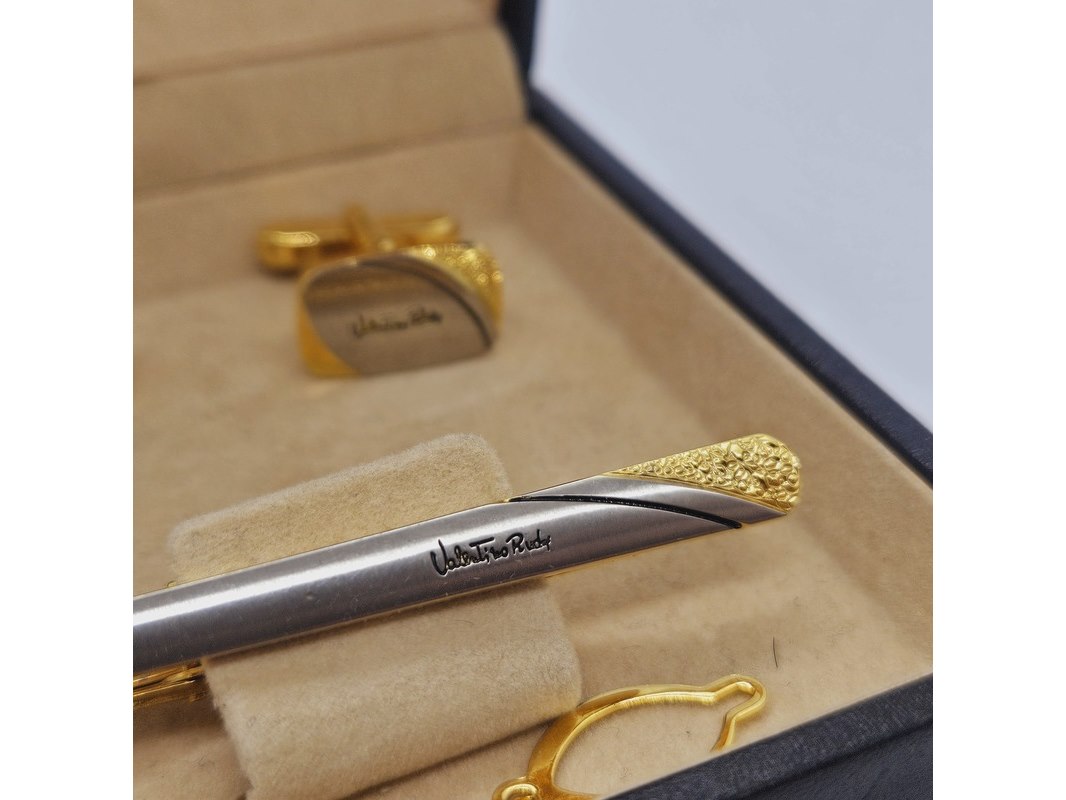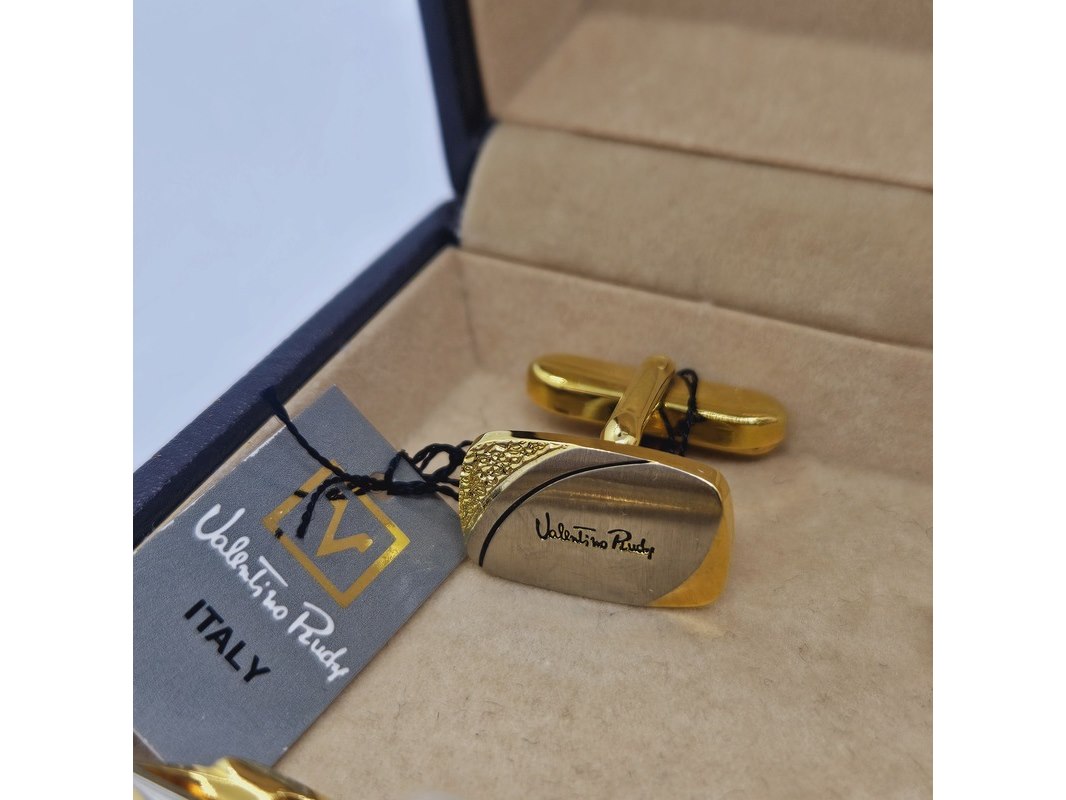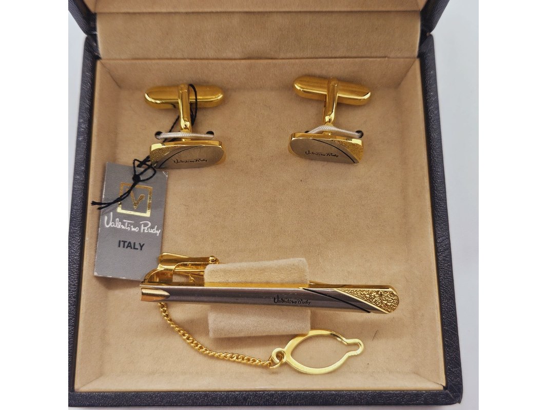 Product: Valentino Rudy manchetknopen + tie pin Conditie: Gebruikt Specificaties: Frosted two tone model. Merk: Valentino Rudy. Inclusief doos.