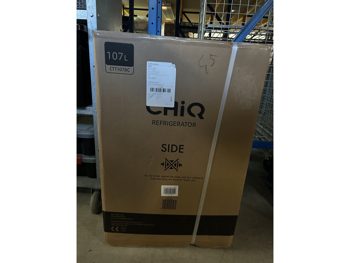 Merk: CHiQ Product: Koel-vriescombinatie 107 liter Afmeting: bxhxd 550x850x560 mm Conditie: nieuw Specificaties: De bezorg- en afhandelingskosten voor deze kavel bedragen €39,95 exclusief btw.