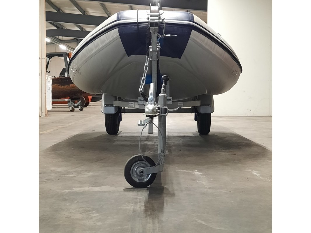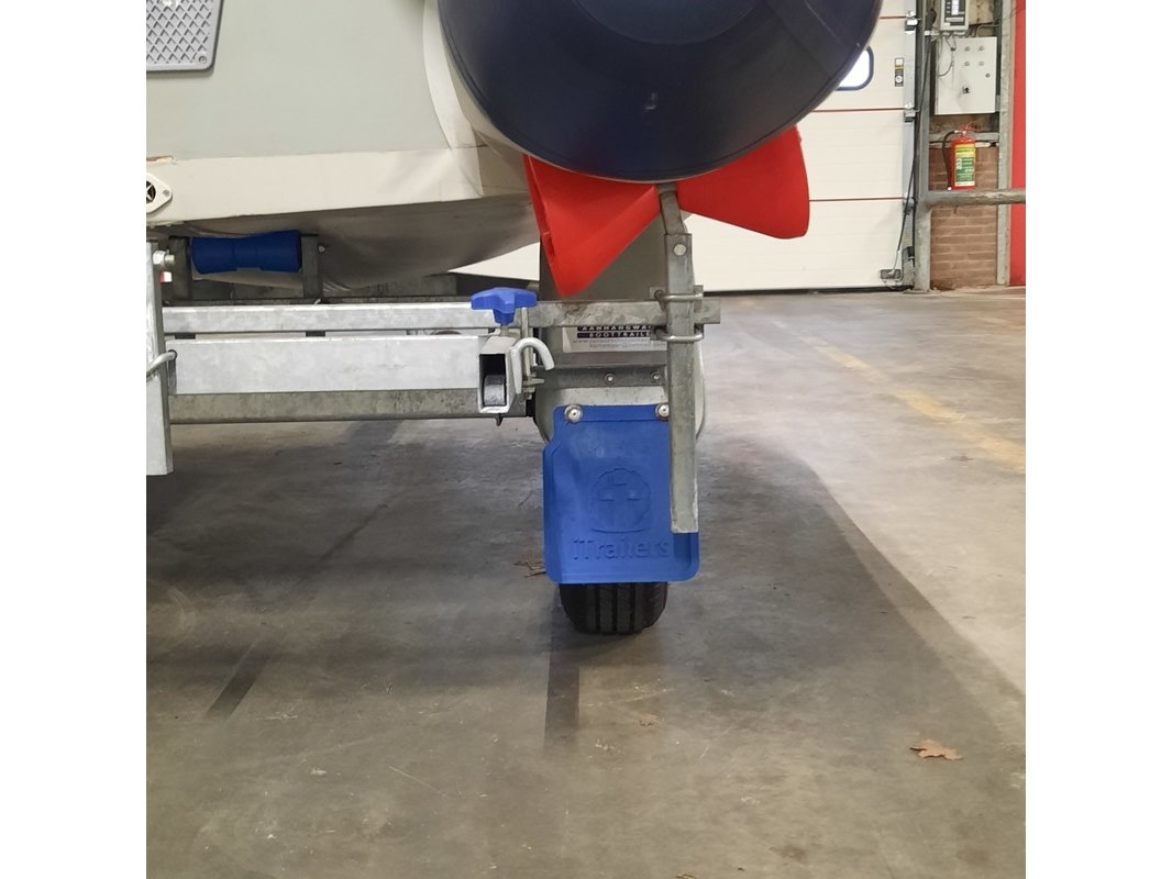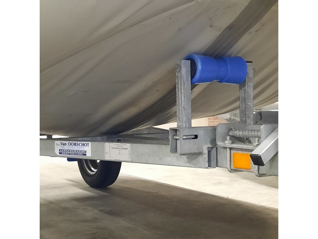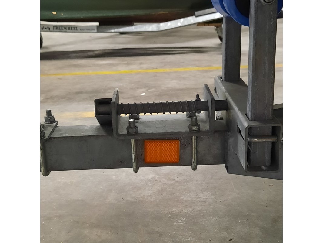 Product: Rubberboottrailer Afmeting: Lengte ca. 450 cm. Conditie: gebruikt Specificaties: Betreft een ongeremde boottrailer 3x kielrol in het midden 2x trompetrol 1x vangmuil aan voorzijde Let op, exclusief lichtbalk!