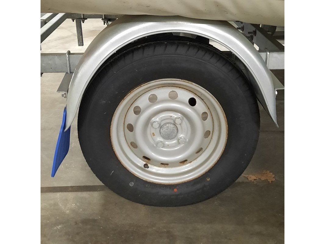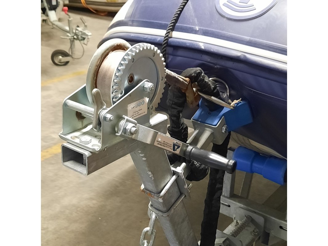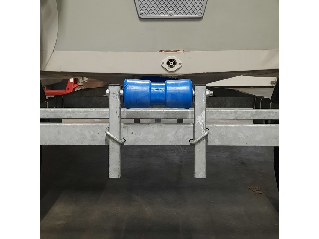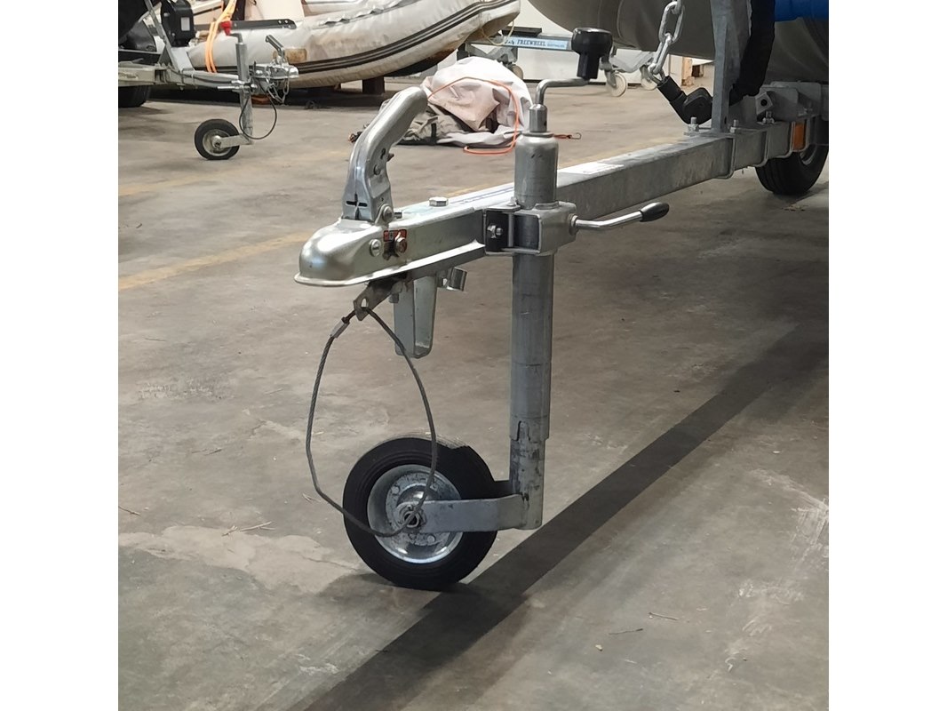 Product: Rubberboottrailer Afmeting: Lengte ca. 450 cm. Conditie: gebruikt Specificaties: Betreft een ongeremde boottrailer 3x kielrol in het midden 2x trompetrol 1x vangmuil aan voorzijde Let op, exclusief lichtbalk!