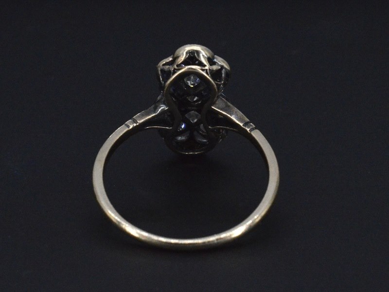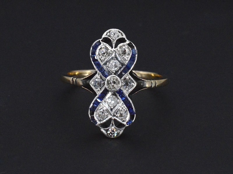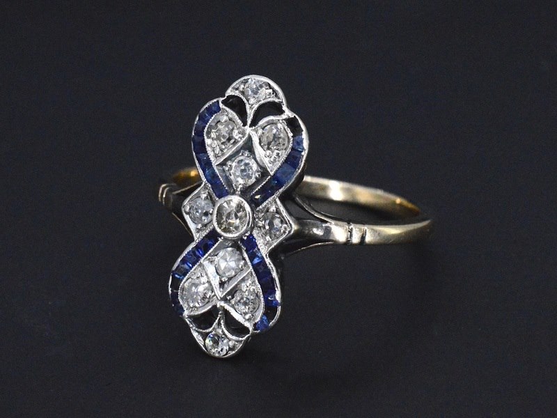 Product: Art deco ring met diamant en saffieren Specificaties: Diamant: Natuurlijk Slijpvorm: old mix geslepen Gewicht (carat): 0.50 carat Kleur: wit Zuiverheid: Met natuurlijke insluitsels Edelsteen: Saffieren Slijpvorm: vierkant geslepen Gewicht (carat): 0.10 carat Kleur: Blauw Zuiverheid: Met natuurlijke insluitsels Juweel: Ring Gewicht: 3.1 gram Ringmaat (op maat gemaakt*): 57,5 (18,5 mm) Materiaal: 14k goud (585) Conditie: Antiek Verpakking: Luxe sieradendoos Toelichting: De kwaliteit is overgenomen van het rapport behorend bij item. De waardebepaling is een beoordeling van een gecertificeerde diamantair, gebaseerd op consumentenprijzen. Extra informatie: 3 saffiertjes ontbreken Consumentenprijs: € 3.600,-