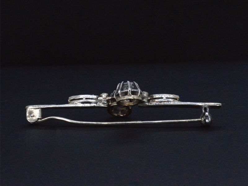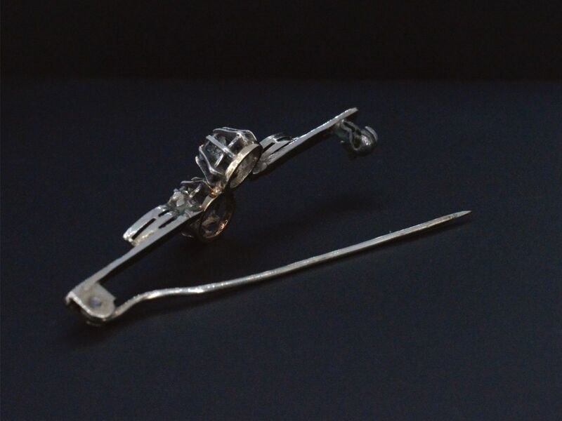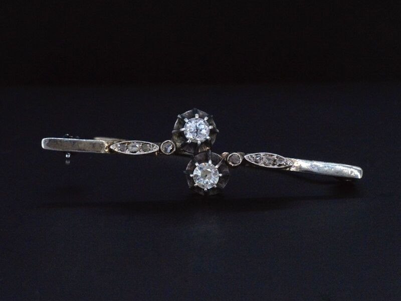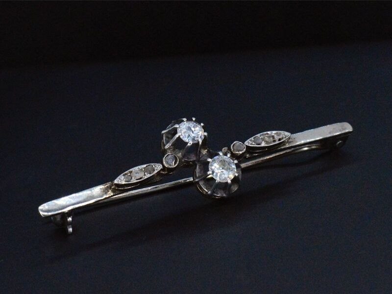 Product: Gouden broche met diamanten Specificaties: Diamant: Natuurlijk Aantal: 2 stuks Slijpvorm: Old geslepen Gewicht (carat): 0.50 carat Kleur: Wit getint Zuiverheid: Met natuurlijke insluitsels Diamant (secundair): Diamanten Aantal diamanten: 8 stuks Slijpvorm: Roos geslepen Gewicht (carat): 0.08 carat Kleur: Wit Zuiverheid: Met natuurlijke insluitsels Juweel: Broche Gewicht: 4 gram Afmetingen/lengte: 52 x 14 mm Materiaal: Goud en zilver Conditie: Vintage Verpakking: Luxe sieradendoos Toelichting: De kwaliteit is overgenomen van het rapport behorend bij item. De waardebepaling is een beoordeling van een gecertificeerde diamantair, gebaseerd op consumentenprijzen. Consumentenprijs: € 2.500,-