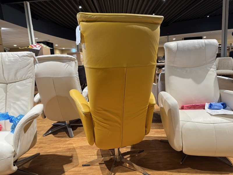 Relaxfauteuil, geel leer, elektrisch verstelbaar, chromen poot