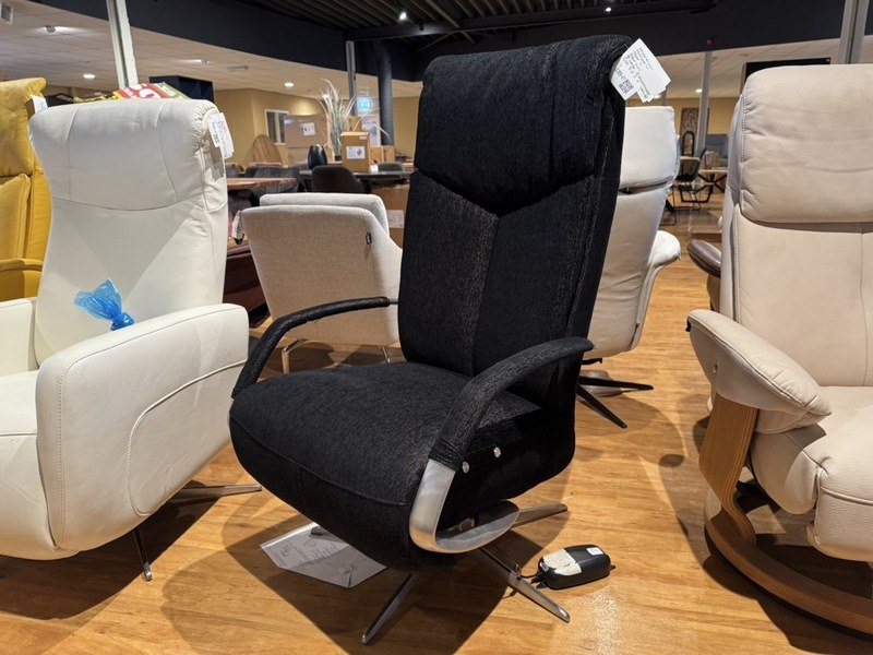 Relaxfauteuil, zwart stof, elektrisch verstelbaar, chromen poot