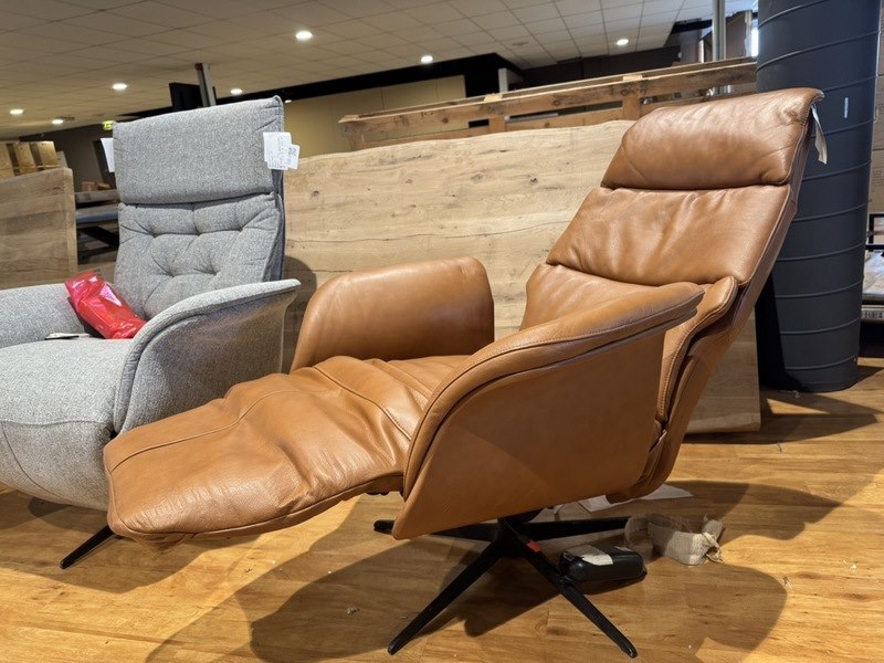 Merk: Hjort Knudsen Product: Relaxfauteuil Kleur: cognac Materiaal: leer Afmeting: L Specificaties: Nieuw uit verpakking