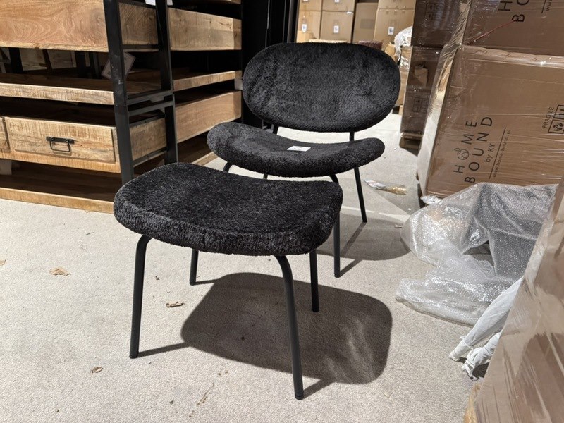 Merk: Home Bound by KY Product: Fauteuil + hocker Kleur: zwart Materiaal: stof Afmeting: 71x66x77 cm / 50x35x44cm Specificaties: Nieuw in verpakking