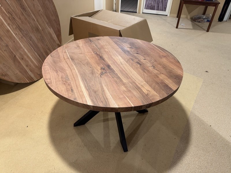 Eettafel, rond acaciahout, zwart metalen spinpoot