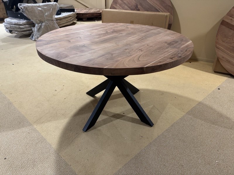 Eettafel, rond acaciahout, zwart metalen spinpoot