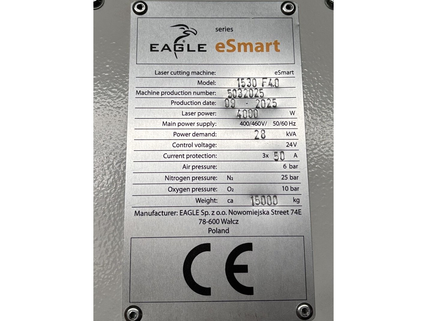 Merk: Eagle Product: Lasersnijmachine Conditie: ongebruikt Specificaties: Snij snelheid: max. 100m/min Positie: 140m/min Acceleratie: max. 2G Werkgebied: X-as: 3060mm Y-as: 1540mm Z-as: 100mm max. plaat gewicht: 1000kg Afmetingen van de machine: Lengte: 10000mm Breedte: 3080mm Hoogte: 3060mm Eigengewicht: 18 ton De leveromvang van deze kavel omvat alleen deze Eagle eSmart 1530 lasersnijmachine en de daarbij geleverde op- en aanbouwdelen. Mogelijk zijn er voor de ingebruikname van deze Eagle eSmart 1530 lasersnijmachine aanvullende services/gebruikersrechten nodig. Alle aanvullende dienstverlening/service of garanties (zie bijgesloten documentatie) afgenomen bij of aangeboden door een derde partij (waaronder fabrikant Eagle, erkende Eagle importeurs of gecertificeerde partners van Eagle) zijn voor rekening en risico van de koper en zijn geen onderdeel van deze kavel. Voor aanvullende informatie m.b.t. de mogelijke dienstverlening van Eagle verwijzen wij naar de Eagle fabrikant of een lokale Eagle importeur. Meer info via: Distributors list - EAGLE Lasers Documenten Specification Technical documentation eSmart 1530 4kW-O1 eSmart Foundation