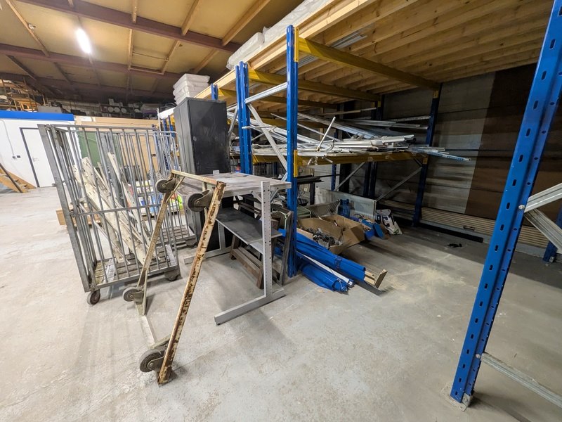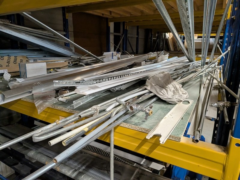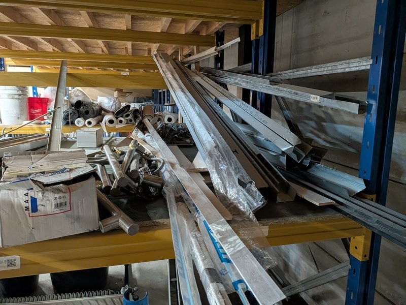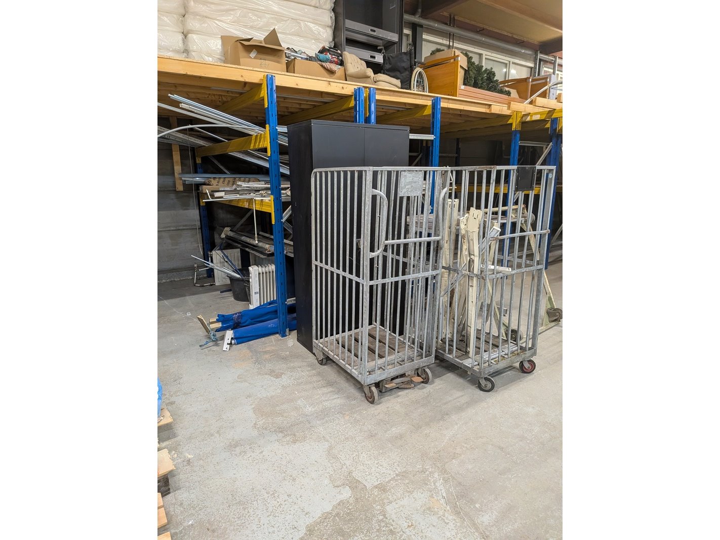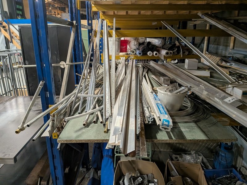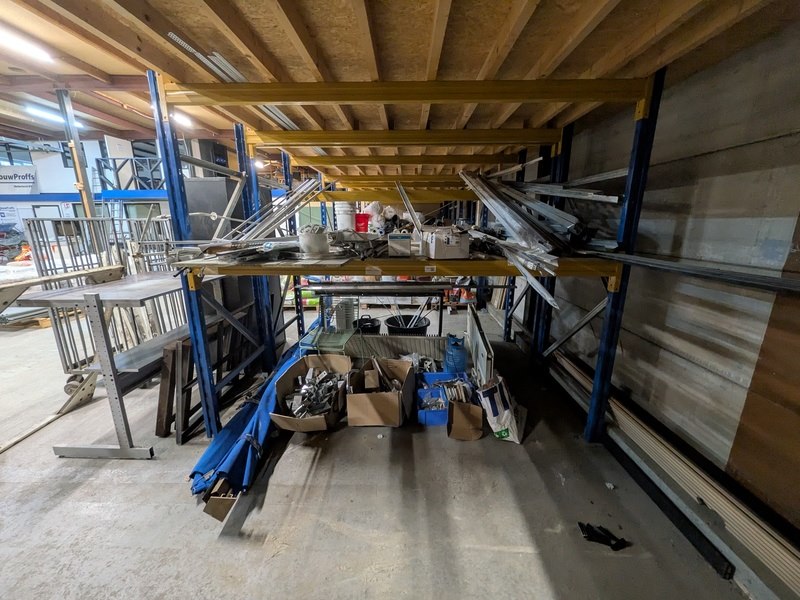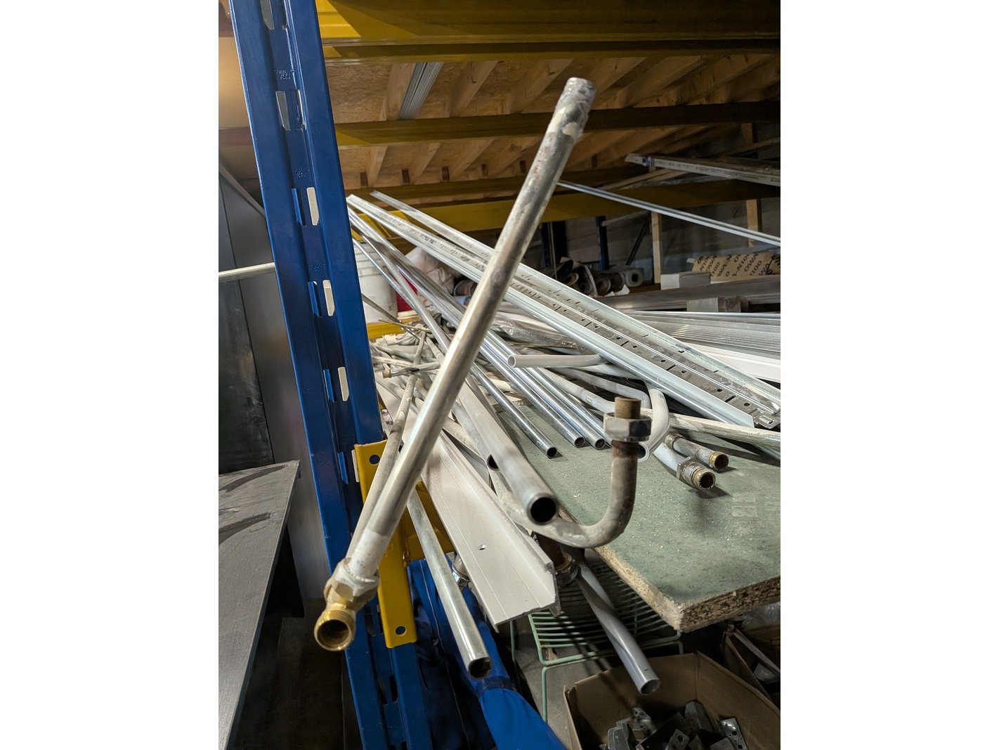 Product: Partij ijzerwaren Materiaal: Metaal Afmeting: Max. lengte ca. 400cm Specificaties: Bestaande uit diverse aluminium hoekprofielen, metalen profielen, buismateriaal, metaaldraad, balkdragers, kranen, deurkruk, 2x radiator, hoge tafel, 2x rolcontainer, metalen onderstel t.b.v. tafel, werkplaatskast, etc. Exclusief stelling