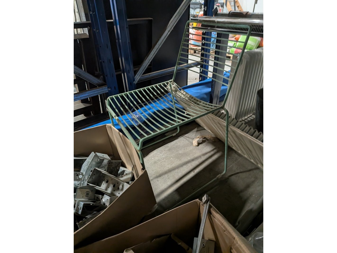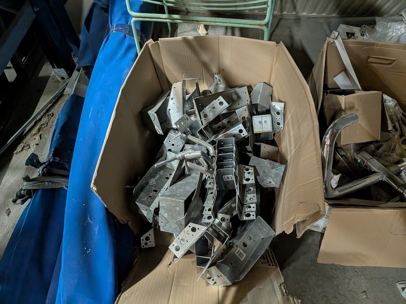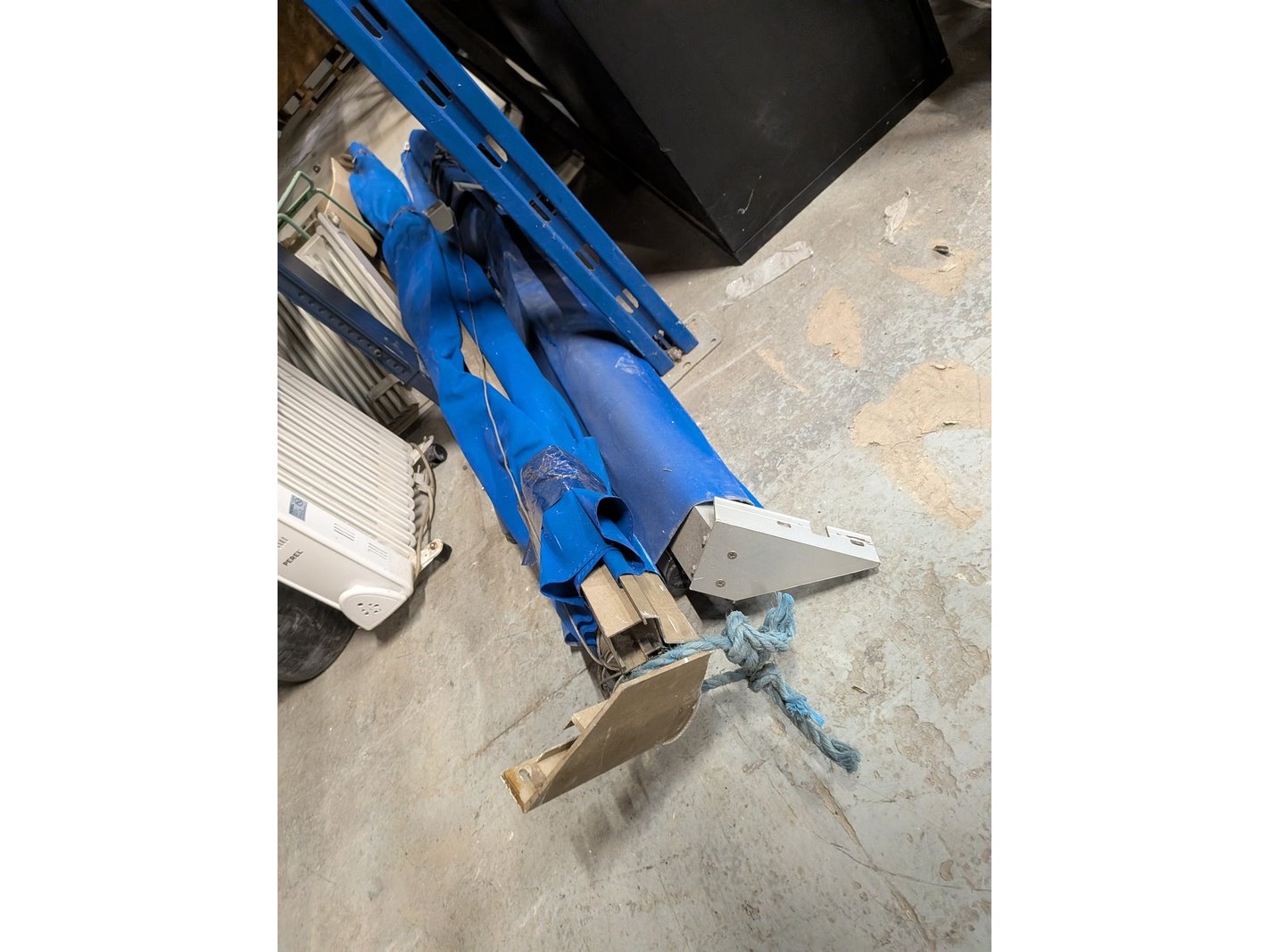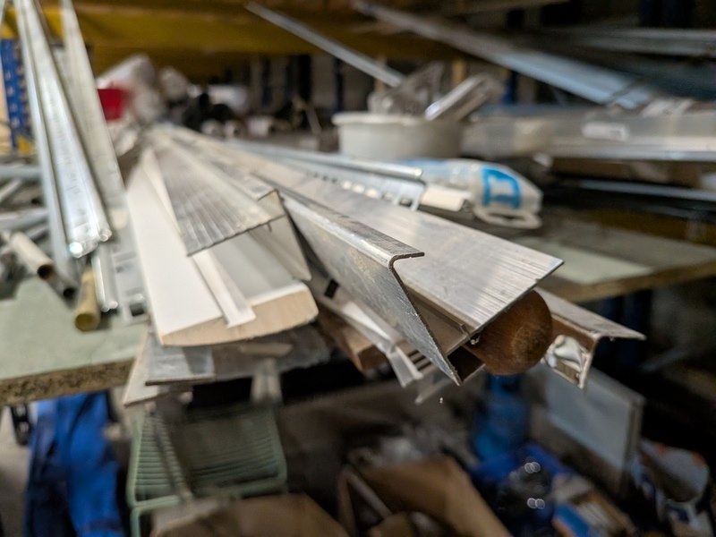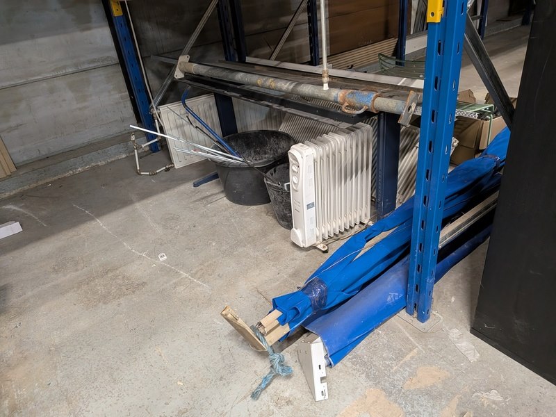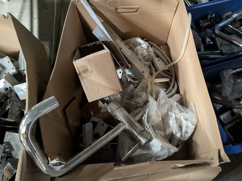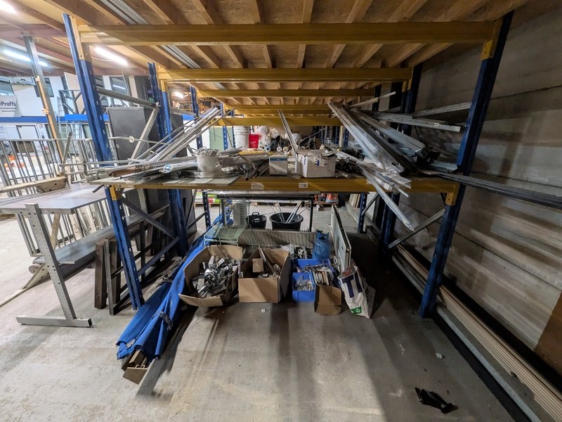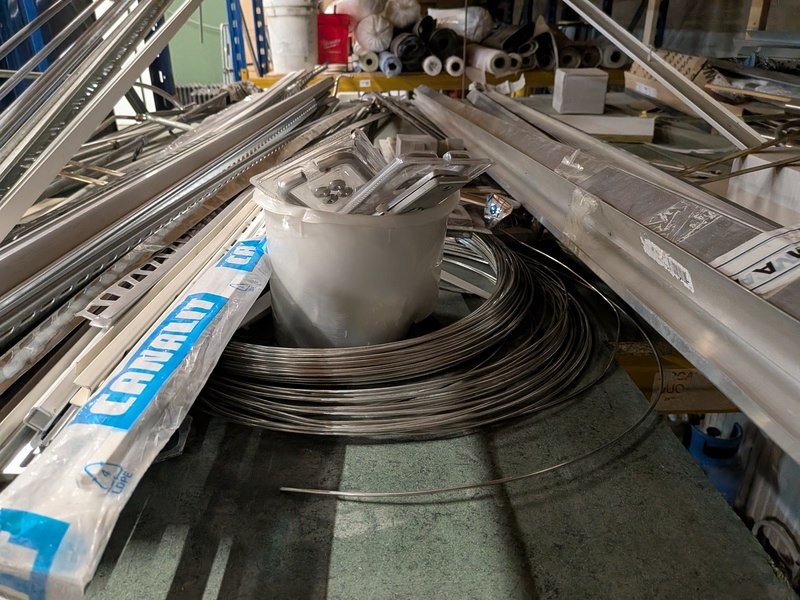 Product: Partij ijzerwaren Materiaal: Metaal Afmeting: Max. lengte ca. 400cm Specificaties: Bestaande uit diverse aluminium hoekprofielen, metalen profielen, buismateriaal, metaaldraad, balkdragers, kranen, deurkruk, 2x radiator, hoge tafel, 2x rolcontainer, metalen onderstel t.b.v. tafel, werkplaatskast, etc. Exclusief stelling