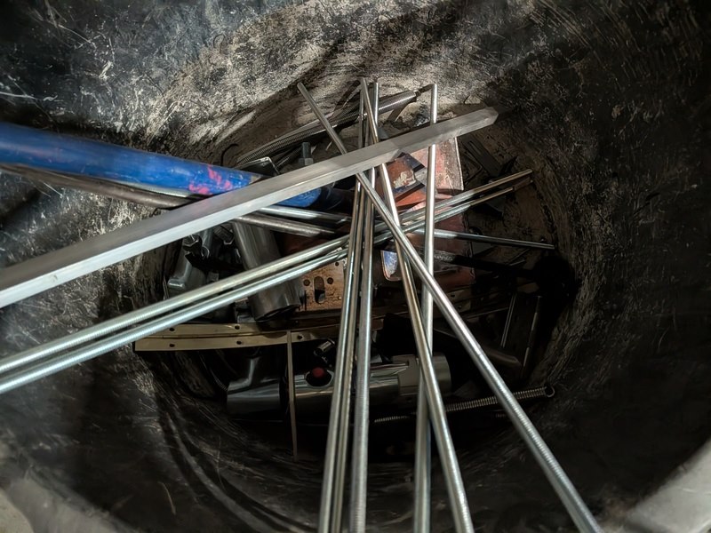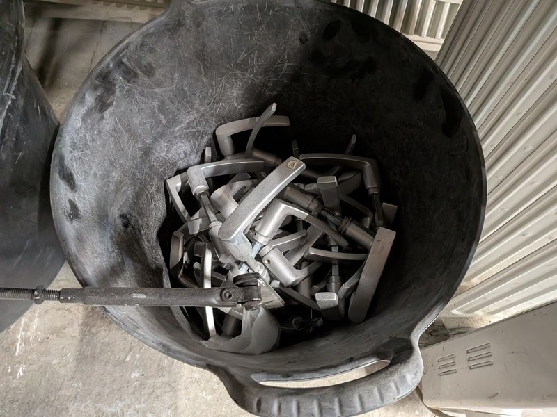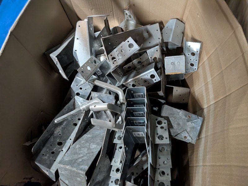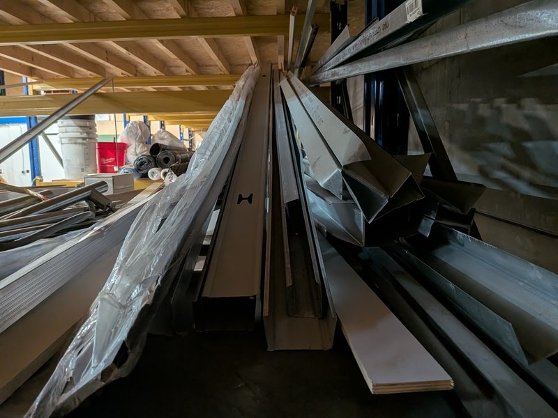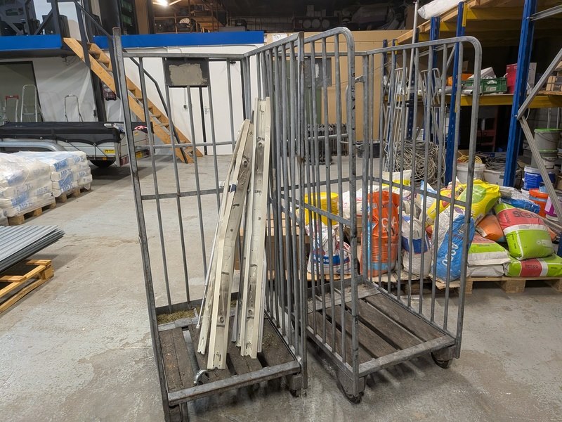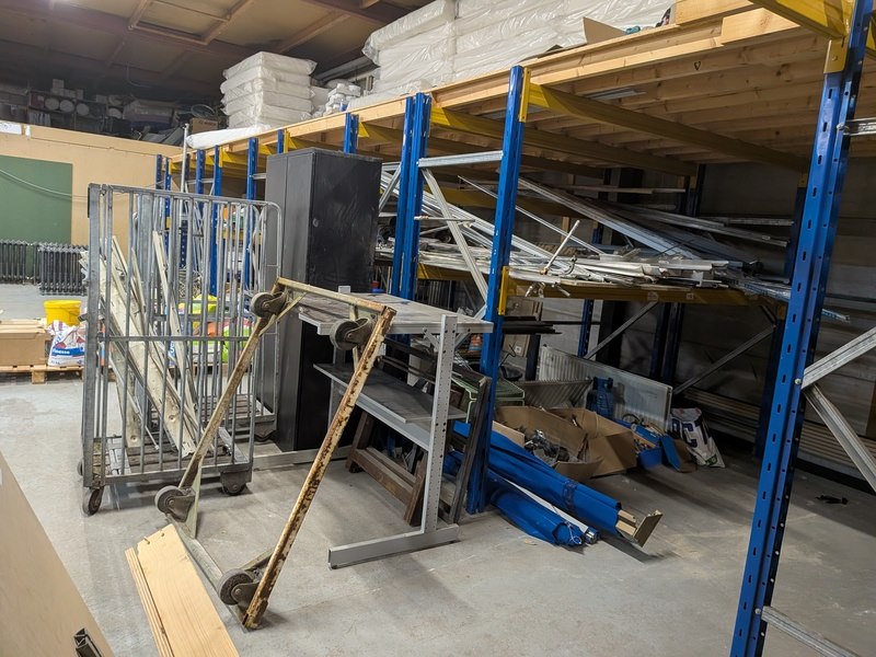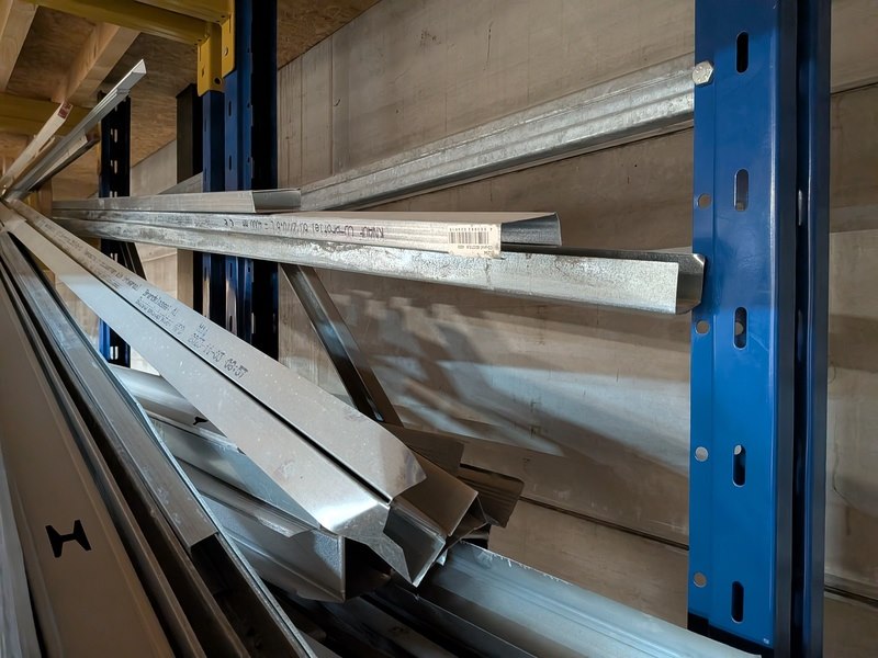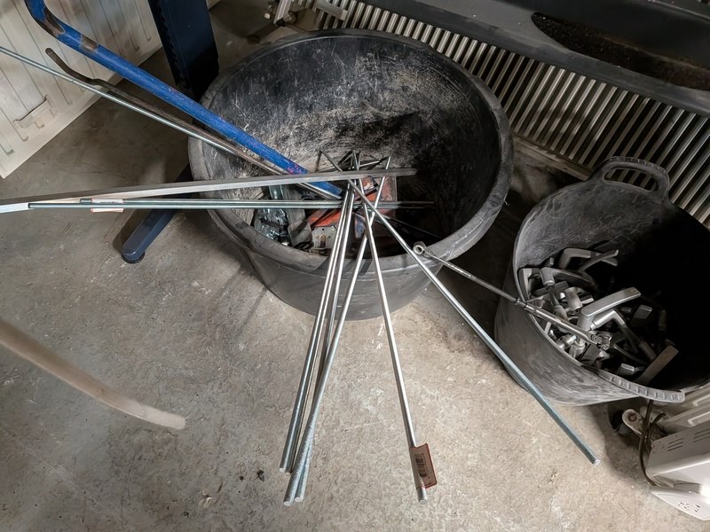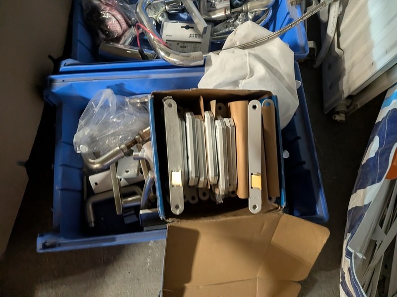 Product: Partij ijzerwaren Materiaal: Metaal Afmeting: Max. lengte ca. 400cm Specificaties: Bestaande uit diverse aluminium hoekprofielen, metalen profielen, buismateriaal, metaaldraad, balkdragers, kranen, deurkruk, 2x radiator, hoge tafel, 2x rolcontainer, metalen onderstel t.b.v. tafel, werkplaatskast, etc. Exclusief stelling