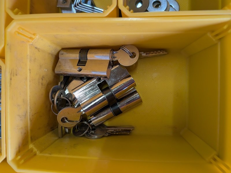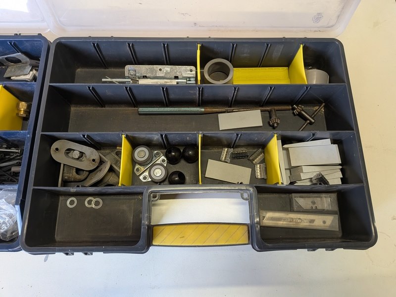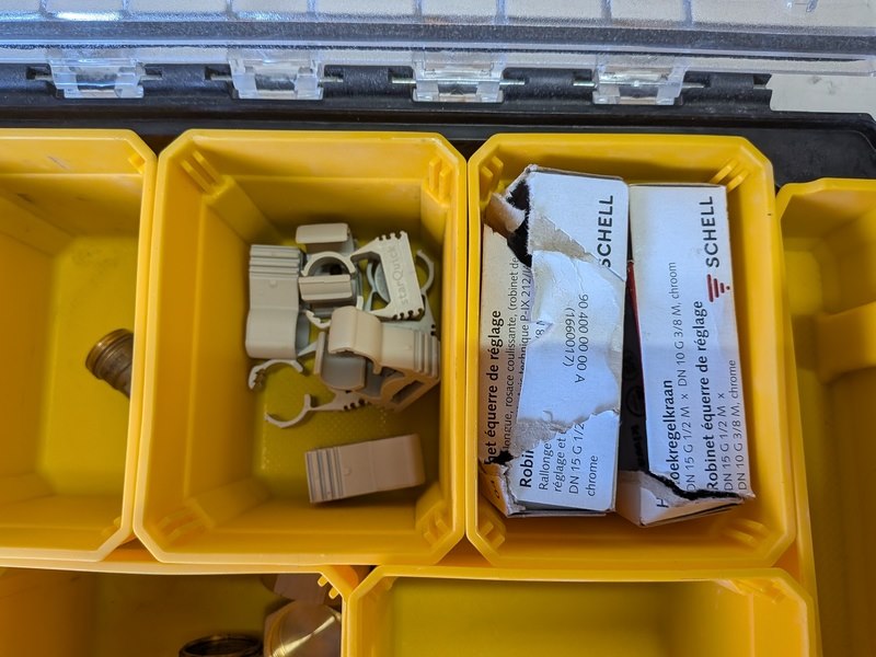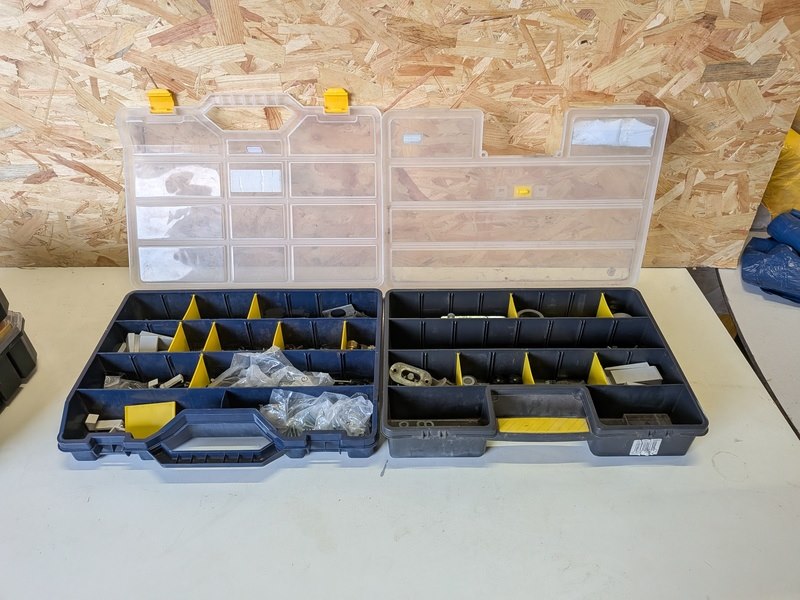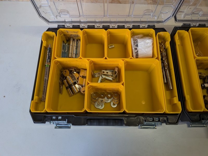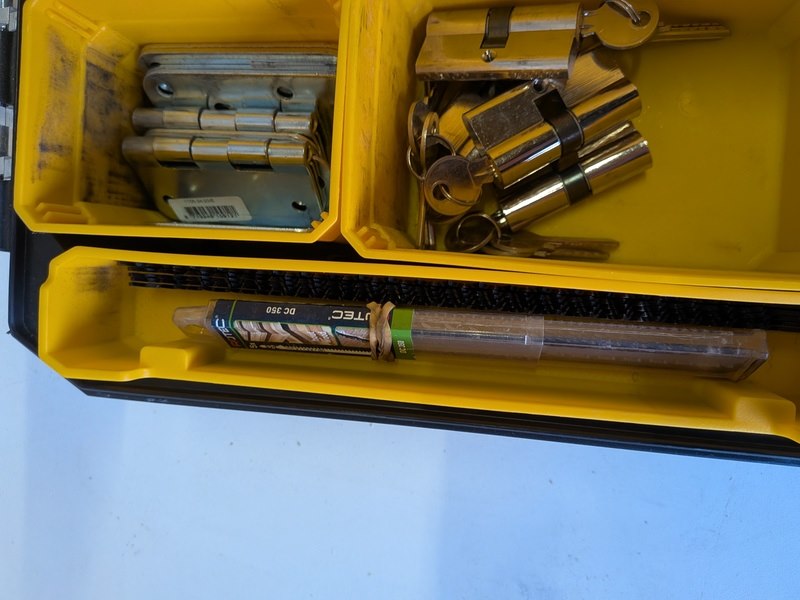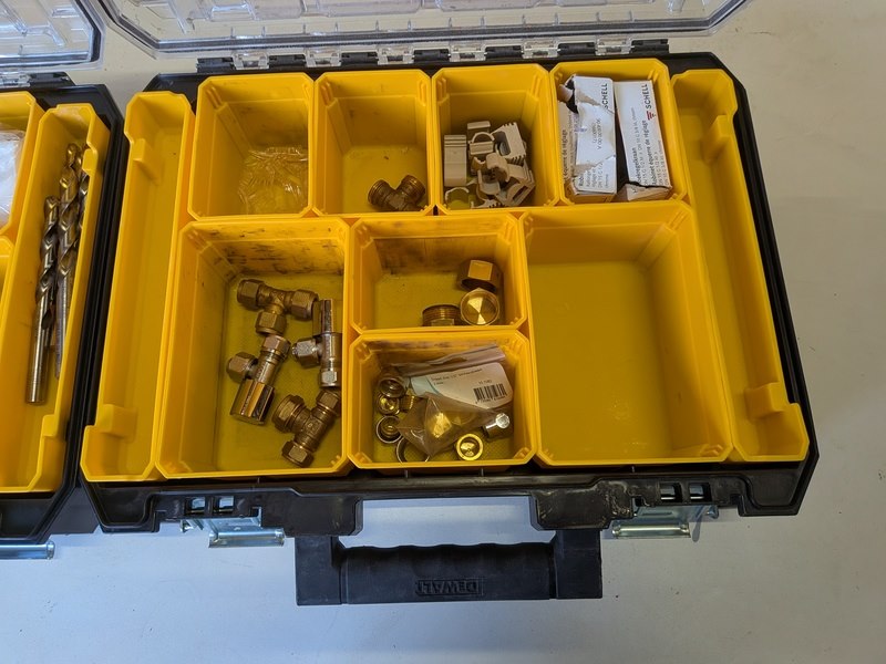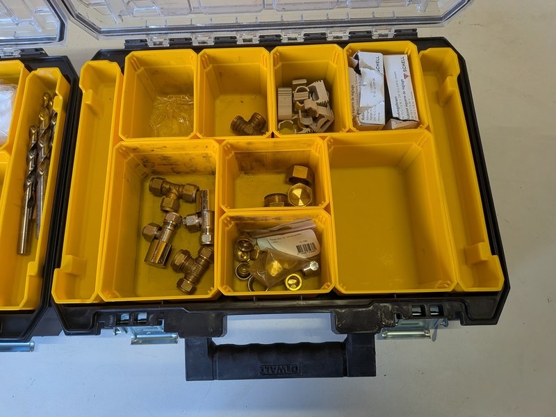 Merk: O.a. Dewalt Product: Assortimentskoffer met ijzerwaren Conditie: gebruikt Specificaties: Bestaande uit o.a. 2x DeWalt koffer, koppelingen, ringen, boren, cilindersloten, diverse koppelingen, schroeven, breekmesjes, etc.
