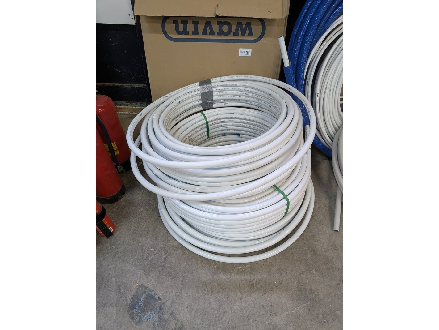 Merk: Wavin Product: Meerlagen buis Conditie: nieuw Specificaties: Inclusief diverse reststukken en buismateriaal Bestaande uit 4x rol meerlagenbuis, waarvan: 1x buis 25 x 2.5, ca. 44 meter 2x buis 25 x 2.5, ca. 50 meter 1x buis 25 x 2.5, ca. 43 meter