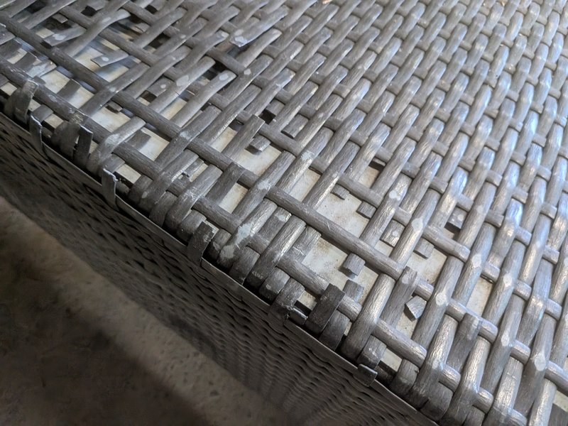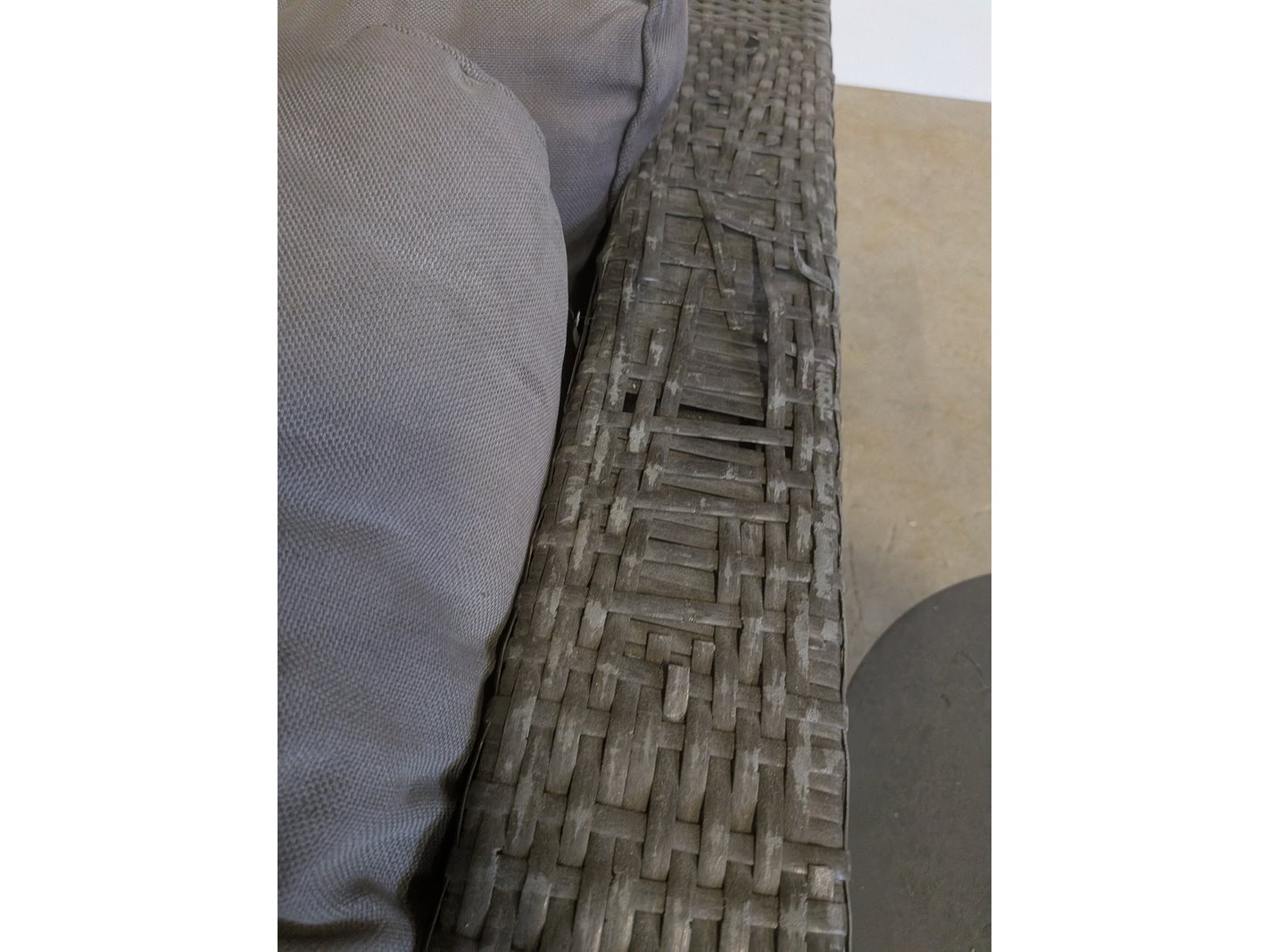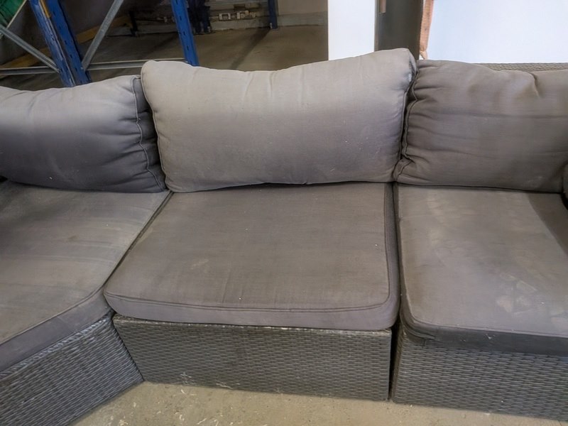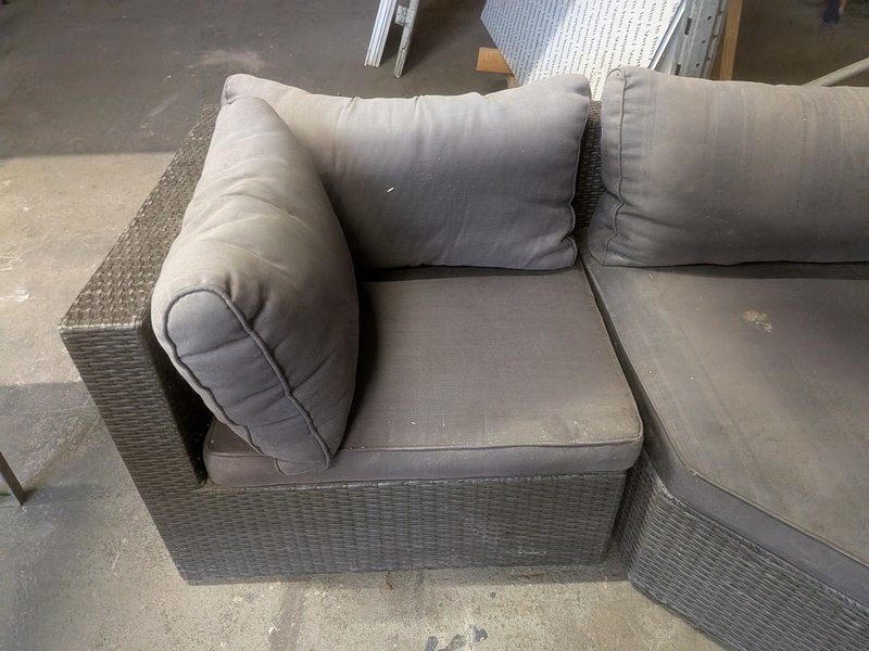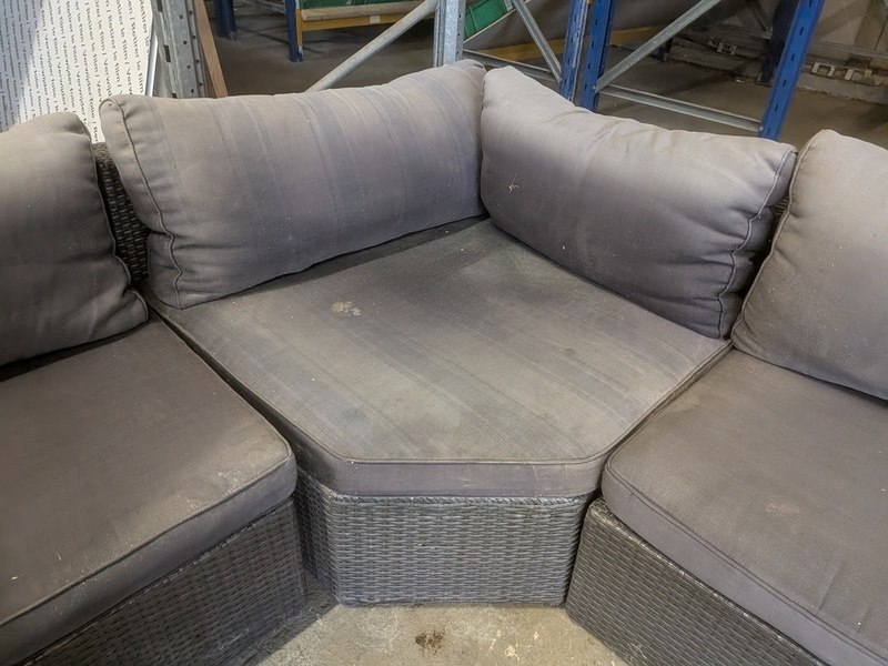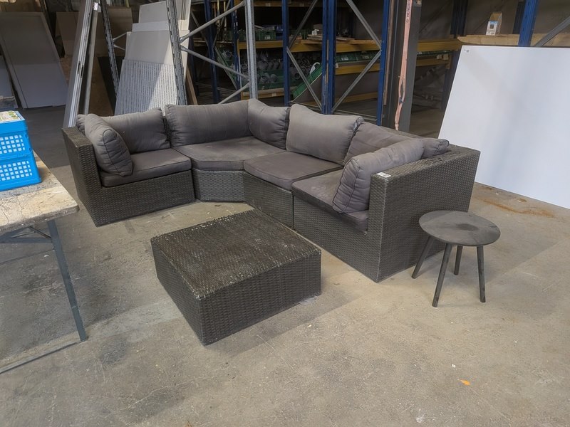Product: Terrasmeubel Conditie: gebruikt Specificaties: totale opstelling (lxb) ca. 273 x 197 / 84 cm, zithoogte ca. 40 cm kussens verkleurd door de zon, vlechtwerk deels beschadigd