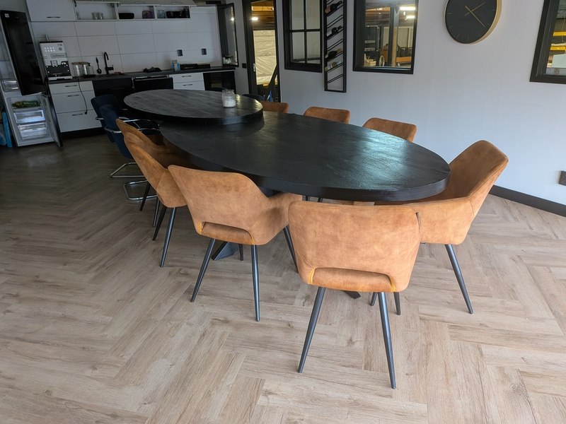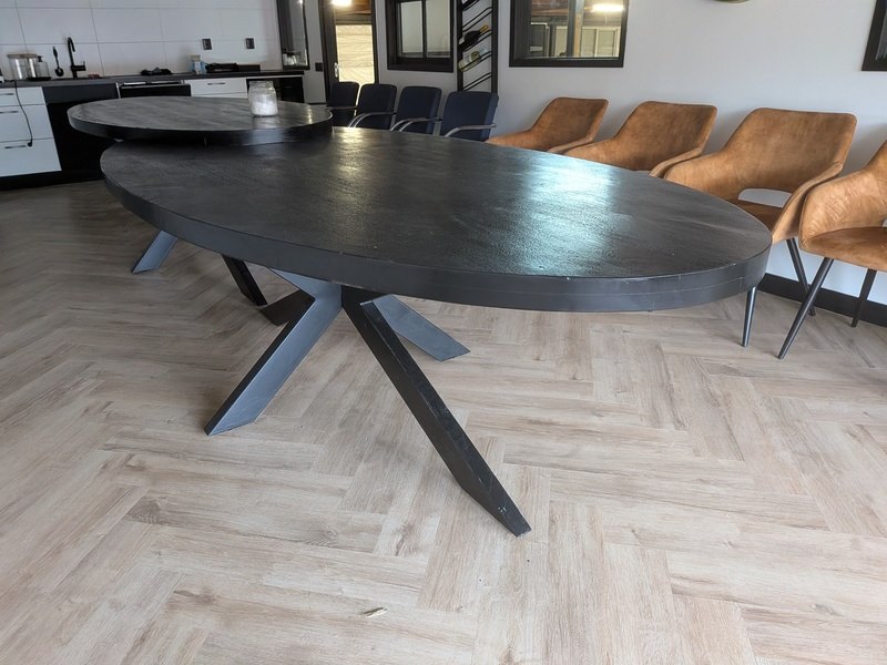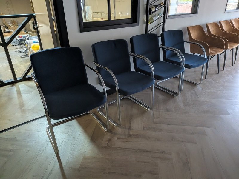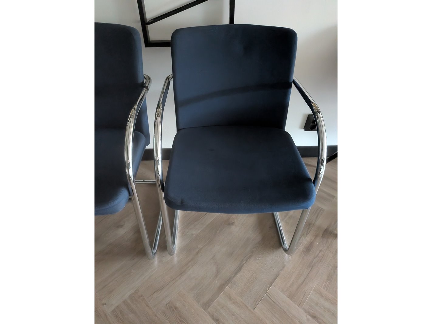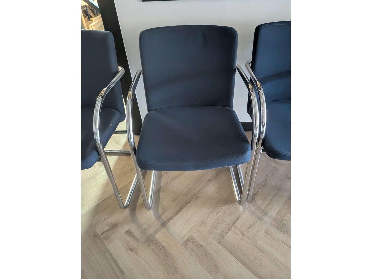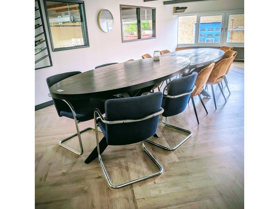 Product: Vergadertafelopstelling Conditie: gebruikt Specificaties: Bestaande uit: 1x tafel, houten blad, metalen onderstel (lxbxh) ca. 422 x 111 x 84.5 cm 4x stoel, blauw, zithoogte ca. 46cm, 8x stoel, zithoogte ca. 46cm Let op! De kavel bevindt zich op een verdieping alleen toegankelijk via trap De tafel bestaat uit één geheel - de ovale delen zijn aan elkaar vastgezet - de koper dient zelf te zorgen voor demontage