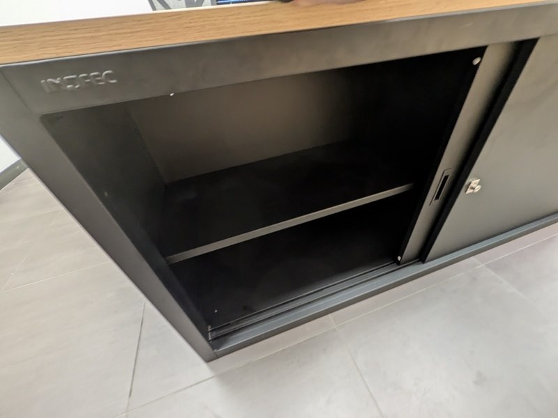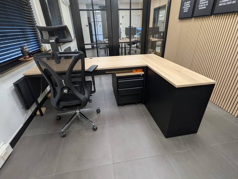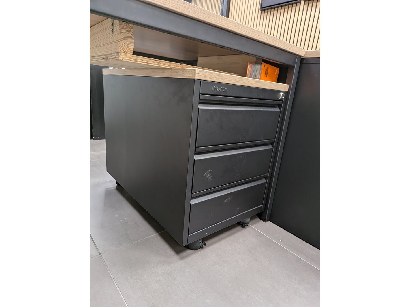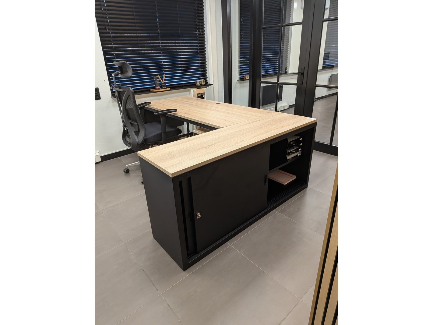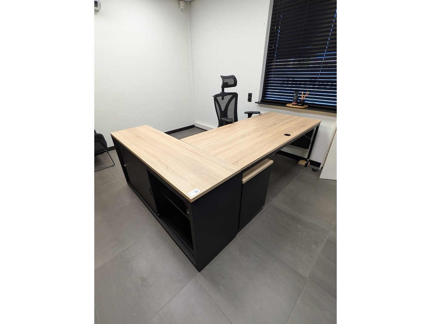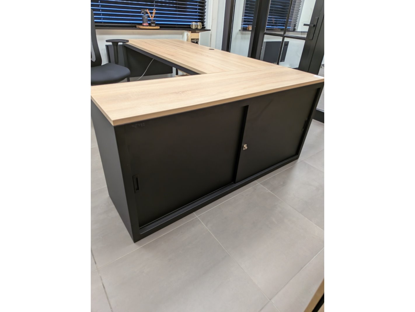 Product: Bureau opstelling Conditie: gebruikt Specificaties: Bestaande uit: 1x bureautafel (lxbxh) ca. 180 x 80 75 cm 1x kantoorkast (lxbxh) ca. 160 x 45 x 75 cm, zonder sleutel 1x ladekast 1x bureaustoel