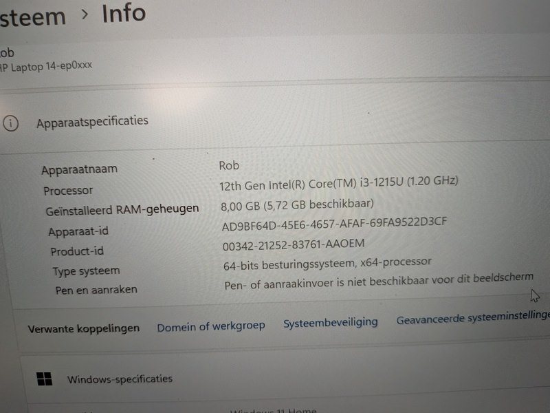 Merk: HP Product: Laptop Conditie: gebruikt Specificaties: Processor: 12th Gen Intel(R) Core(TM) i3-1215U (x86_64) Motherboard: HP 8B29 Memory: 5.71 GB Disk Size: 477 GB Inclusief adapter Computer zal ten tijde van afgifte teruggebracht zijn naar fabrieksinstellingen met een Windows installatie