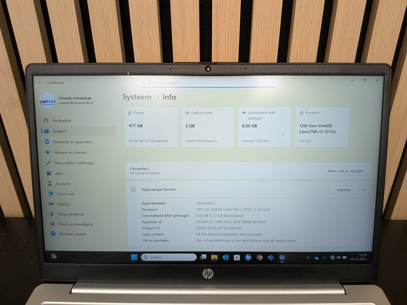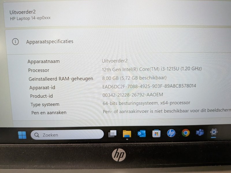 Merk: HP Product: Laptop Conditie: gebruikt Specificaties: Processor: 12th Gen Intel(R) Core(TM) i3-1215U (x86_64) Motherboard: HP 8B29 Memory: 5.71 GB Disk Size: 477 GB Inclusief adapter Computer zal ten tijde van afgifte teruggebracht zijn naar fabrieksinstellingen met een Windows installatie