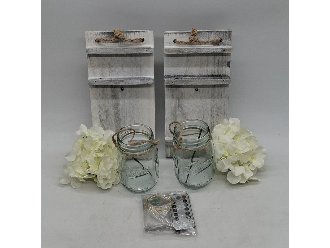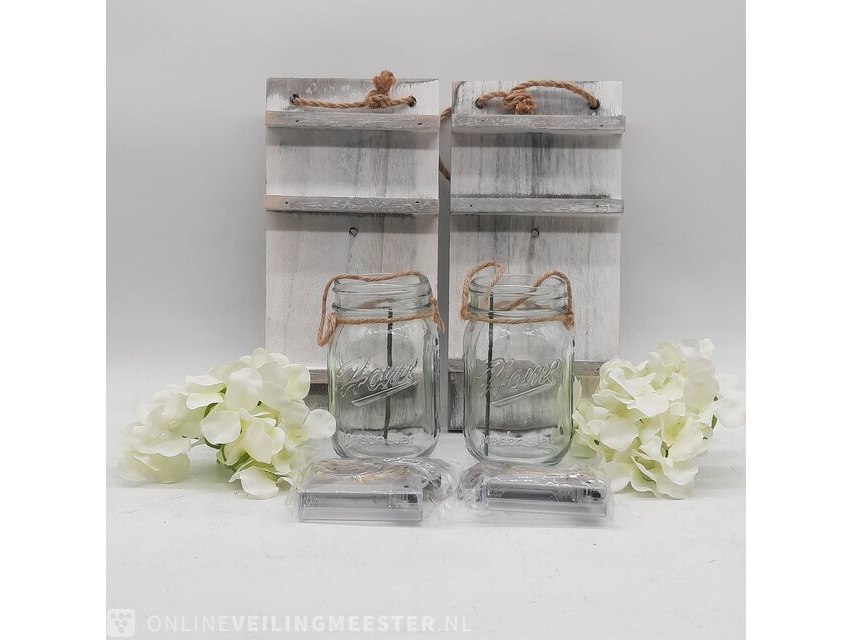 Product: Set glazen decoratiepotjes Afmeting: Hoogte ca. 13 cm. Conditie: Gebruikt Specificaties: Bestaande uit 2x houten plankje, 2x potje, 2x stukje nepbloem.