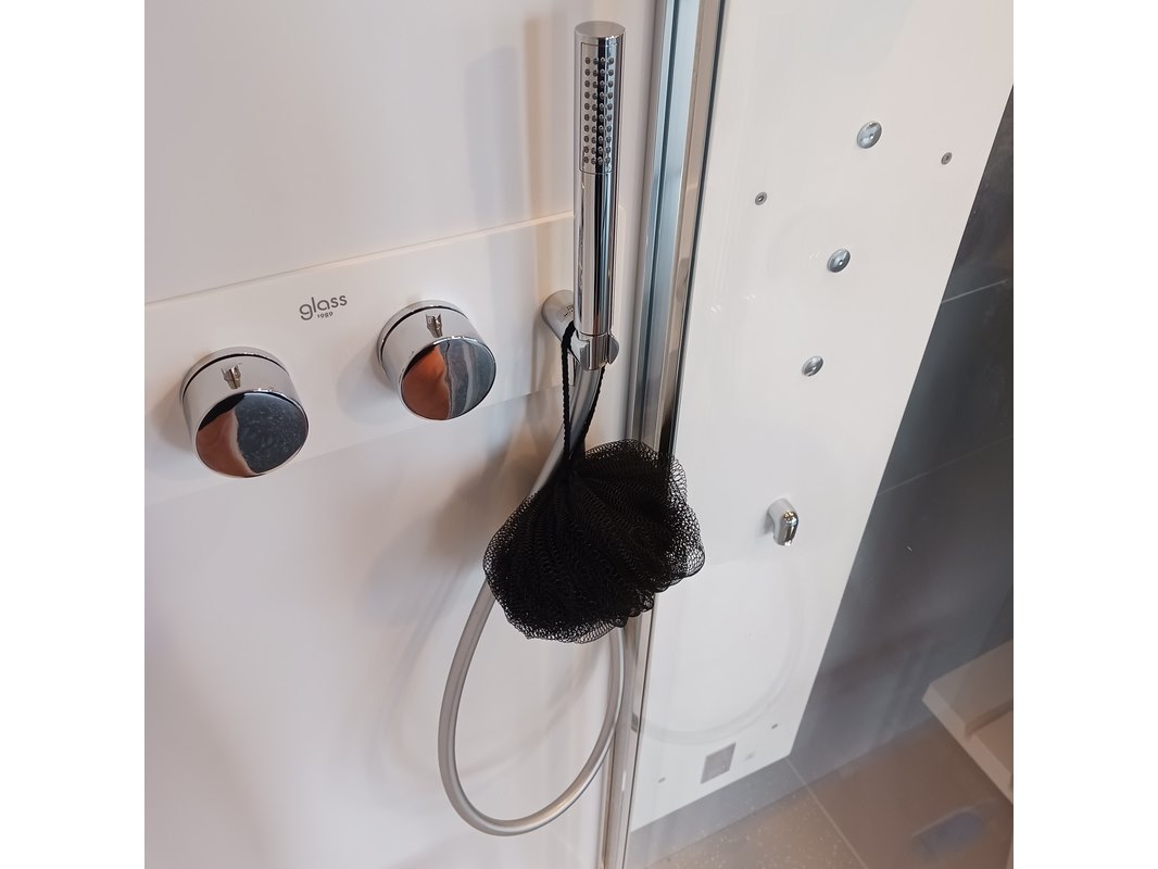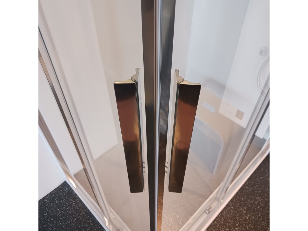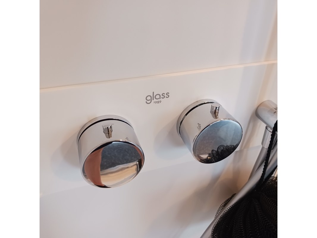 Merk: Glass Product: Showroom douchecabine Specificaties: Compleetheid en werking onbekend. Ligt gedemonteerd op twee pallets.