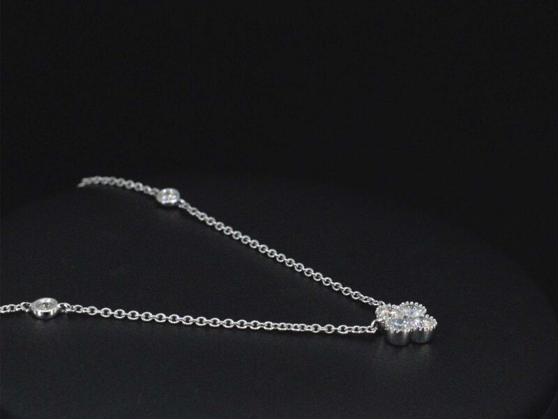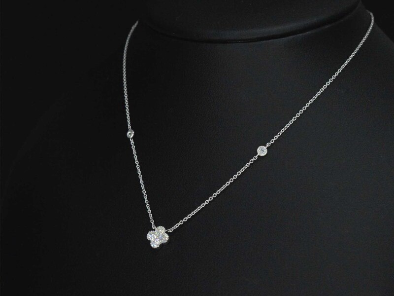 Product: Witgouden collier met diamanten hanger klaver vier Specificaties: Diamant: Natuurlijk Aantal: 7 stuks Slijpvorm: Briljant geslepen Gewicht (carat): 0.30 carat Kleur: F-G Zuiverheid: VS Slijpkwaliteit: Zeer mooi Juweel: Collier Gewicht: 1.9 gram Afmetingen/lengte: 42 cm Materiaal: 18K goud (750) Conditie: Nieuw Verpakking: Luxe sieradendoos Toelichting: De kwaliteit is overgenomen van het rapport behorend bij item. De waardebepaling is een beoordeling van een gecertificeerde diamantair, gebaseerd op consumentenprijzen. Consumentenprijs: € 3.028,-