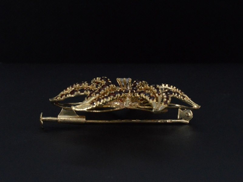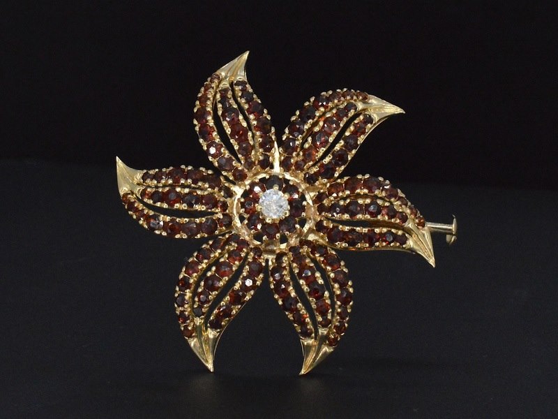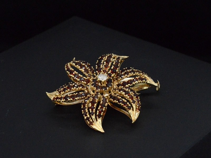 Product: Gouden broche met edelstenen en diamant Specificaties: Diamant: Natuurlijk Slijpvorm: Briljant geslepen Gewicht (carat): 0.25 carat Kleur: F Zuiverheid: P Slijpkwaliteit: Zeer mooi Edelsteen: Kleine edelstenen Kleur: Oranje Juweel: Broche Gewicht: 12 gram Afmetingen/lengte: 42 mm Materiaal: 18k goud (750) Conditie: vintage - zeer mooie staat Verpakking: Luxe sieradendoos Toelichting: De kwaliteit is overgenomen van het rapport behorend bij item. De waardebepaling is een beoordeling van een gecertificeerde diamantair, gebaseerd op consumentenprijzen. Consumentenprijs: € 4.500,-