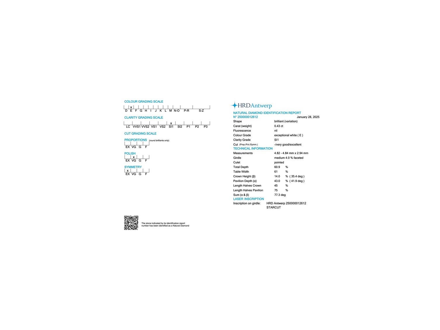 Product: Diamant - 0.43 carat natuurlijke Starcut Briljant geslepen diamant (gecertificeerd) Specificaties: Diamant: Natuurlijk Aantal: 1 stuk Slijpvorm: Starcut Gewicht (carat): 0.43 carat Kleur: E Zuiverheid: SI1 Certificaat: HRD Certificaat nummer: 250000012612 Extra informatie: Deze diamant is een echte Starcut diamant Merk: Starcut Conditie: Nieuw Verpakking: Edelsteendoos Toelichting: De kwaliteit is overgenomen van het rapport behorend bij item. De waardebepaling is een beoordeling van een gecertificeerde diamantair, gebaseerd op consumentenprijzen. Extra informatie: Met laser inscriptie in diamant Consumentenprijs: € 5.500,-