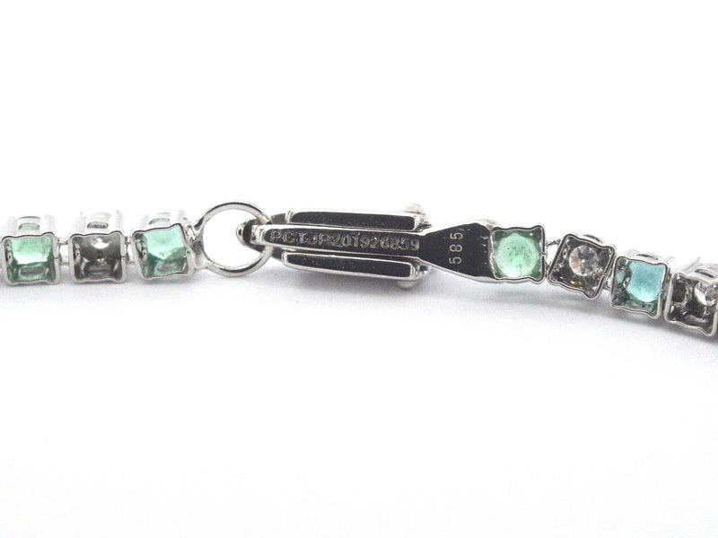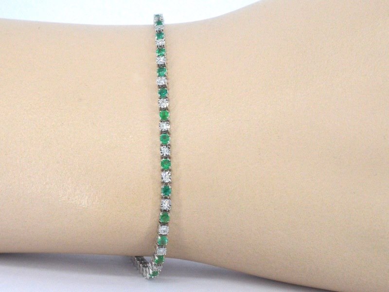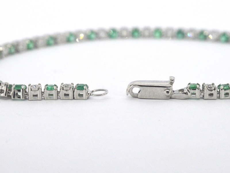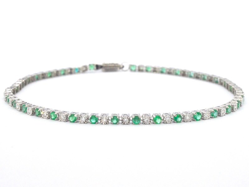 Product: Witgouden tennisarmband met diamanten en smaragden Specificaties: Diamant: Natuurlijk Aantal: 34 stuks Slijpvorm: Rond geslepen Gewicht (carat): 0.30 carat Kleur: F-G Zuiverheid: VS-SI Slijpkwaliteit: Zeer mooi Edelsteen: Smaragd Aantal: 35 stuks Slijpvorm: Rond geslepen Gewicht (carat): 1.20 carat Kleur: Groen Zuiverheid: Met natuurlijke insluitsels Juweel: Armband Gewicht: 3 gram Afmetingen/lengte: 18 cm Materiaal: 14 karaat (585) Conditie: Nieuw Verpakking: Luxe sieradendoos Toelichting: De kwaliteit is overgenomen van het rapport behorend bij item. De waardebepaling is een beoordeling van een gecertificeerde diamantair, gebaseerd op consumentenprijzen. Consumentenprijs: € 3.815,-