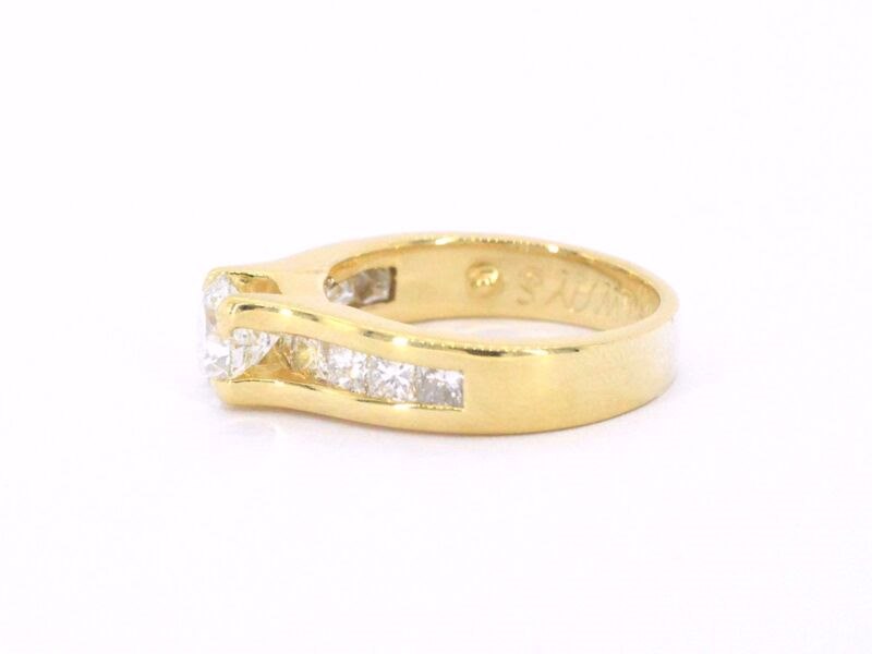 Product: Gouden ring met diamanten Specificaties: Diamant: Natuurlijk Aantal: 1 stuk Slijpvorm: Briljant geslepen Gewicht (carat): 1.01 carat Kleur: I Zuiverheid: SI1 Slijpkwaliteit: Zeer mooi Certificaat: IGI Certificaat nummer: F5A63538 Diamant (secundair): Diamanten Aantal diamanten: 10 stuks Slijpvorm: Prinses geslepen Gewicht (carat): 1.20 carat Kleur: F-G Zuiverheid: VS Slijpkwaliteit: Zeer mooi Juweel: Ring Gewicht: 6.9 gram Ringmaat (op maat gemaakt*): 50 (16 mm) Materiaal: 18K goud (750) Conditie: Zo goed als nieuw Verpakking: Luxe sieradendoos Toelichting: De kwaliteit is overgenomen van het rapport behorend bij item. De waardebepaling is een beoordeling van een gecertificeerde diamantair, gebaseerd op consumentenprijzen. Consumentenprijs: € 24.000,-