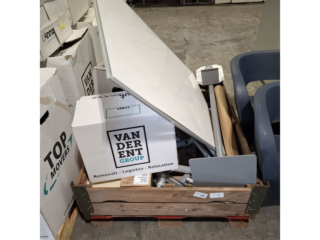 Product: Diverse bedrijfsinventaris Conditie: gebruikt Specificaties: Bestaande uit o.a. Whiteboard, monitorarmen en desinfectie dispenser. Technische staat en compleetheid onbekend. Exclusief palletkist.