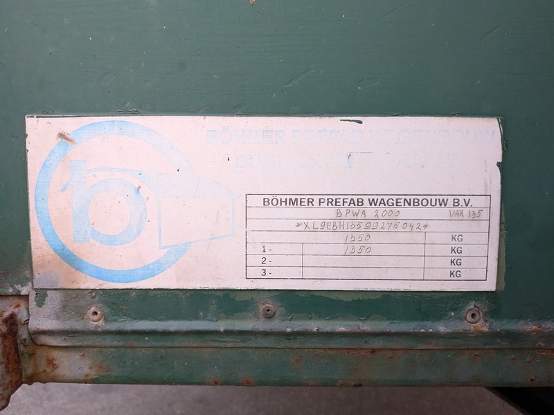 Merk: BOEHMER PREFAB Product: Schaftkeet Afmeting: Opbouw (LxBxH): ca. 4.500 x 2.150 x 2.450 mm BouwJaar: 1999 Conditie: Gebruikt Specificaties: Basiskenmerken Kenteken: WV-31-YH Goedkeuringsnummer: BPWA 2000 VAR 135 Identificatienummer: *XL9EBH13500275042* Datum eerste toelating: 26 mei 1999 Maten & Gewichten Voertuig breedte: 2.180 mm Opbouw (LxBxH) : ca. 4.500 x 2.150 x 2.450 mm Massa rijklaar: 1.000 kg Max massa voertuig: 1.350 kg Laadvermogen: 350 kg