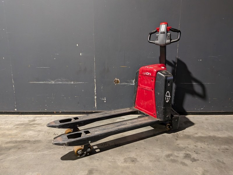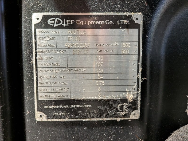 Merk: EP Product: Elektrische pallettruck BouwJaar: 2020 Specificaties: Basiskenmerken Serienummer: 4291603267 Technische gegevens Nominale capaciteit: 1.500 kg Laadcentrum: 600 mm Hefhoogte: 115 mm Onbeladen massa: 157 kg Onbeladen massa (excl. accu) : 149 kg Accuspanning: 24 V Nominaal rijvermogen: 0,75 kW