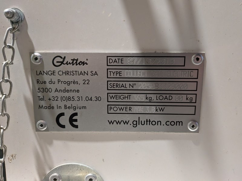 Merk: Glutton Product: Afvalzuiger BouwJaar: 2019 Specificaties: Basiskenmerken Serienummer: 203083329000 Afgelezen tellerstand: 275 u. Technische gegevens Gewicht: 365 kg Capaciteit: 80 kg Vermogen: max. 3,0 kW