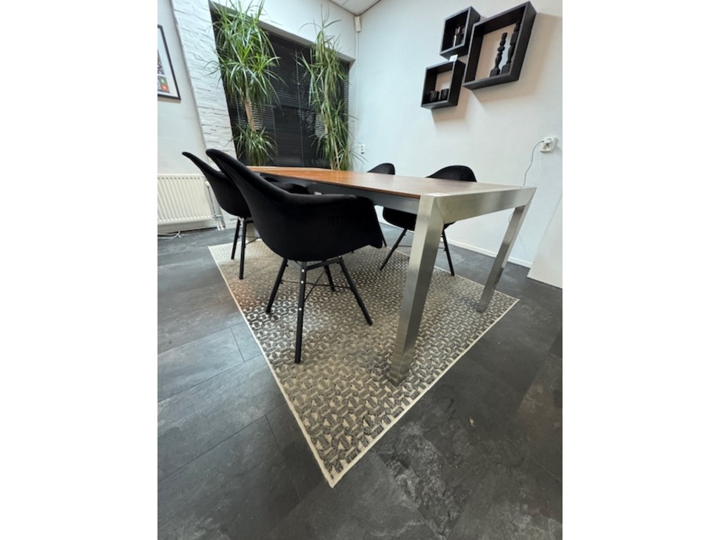 Product: Tafel met 4x stoel en vloerkleed Specificaties: 4x stoel zwart Eames Style, tafel RVS/hout uitschuifbaar 210x90x75cm en vloerkleed bxd ca. 160x22cm