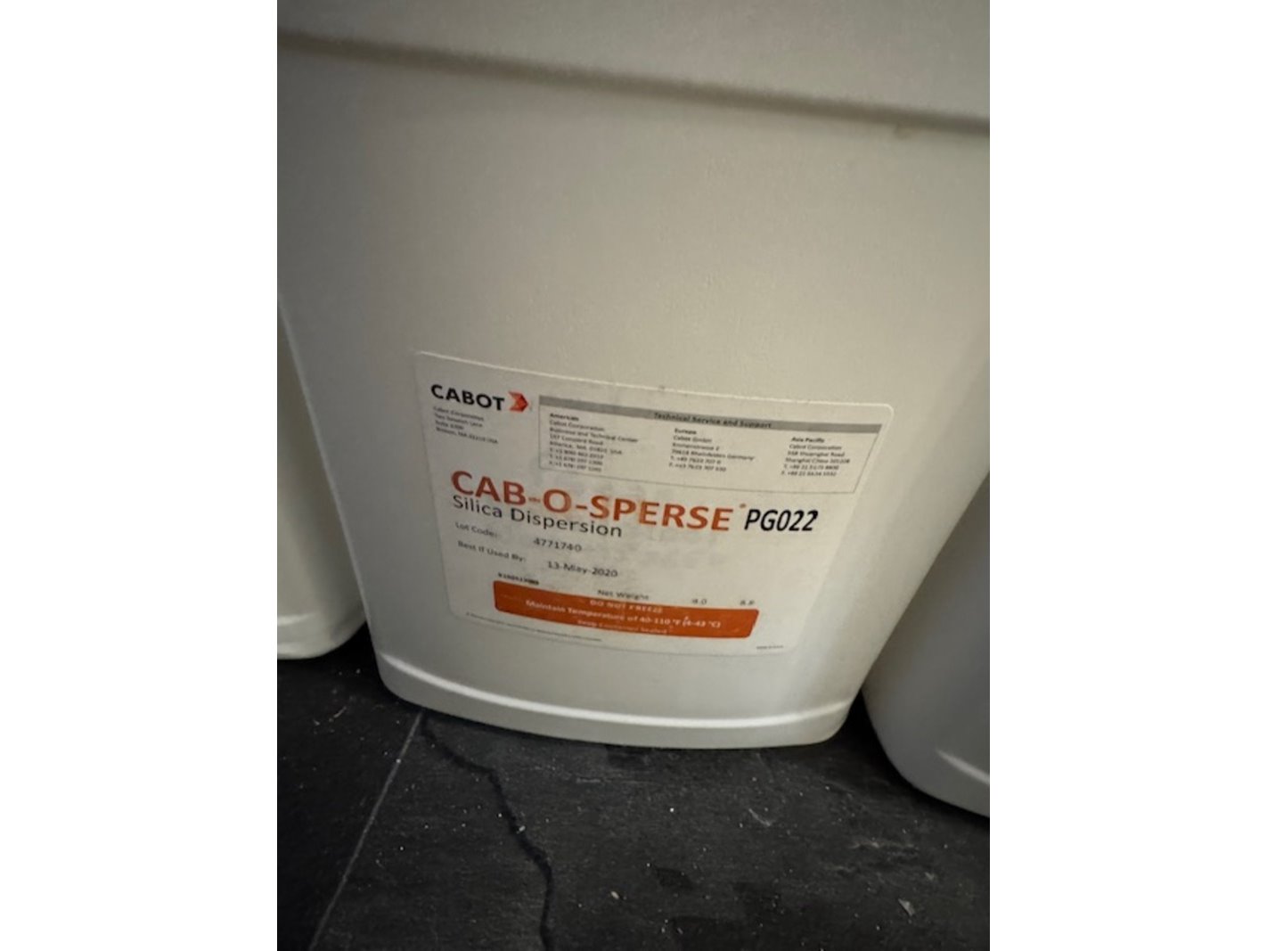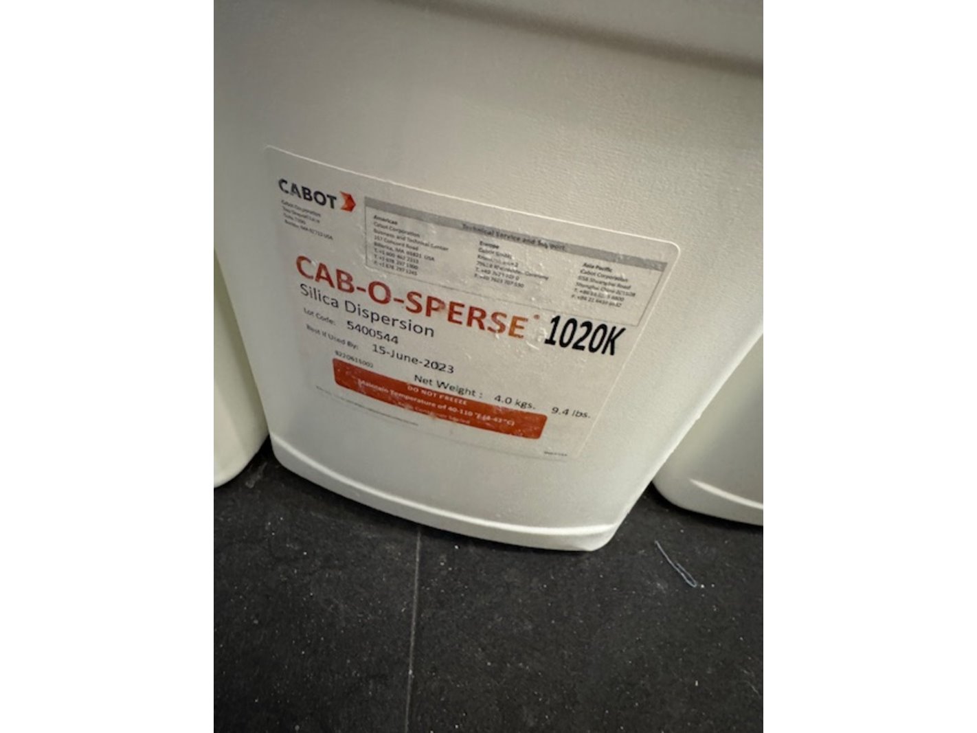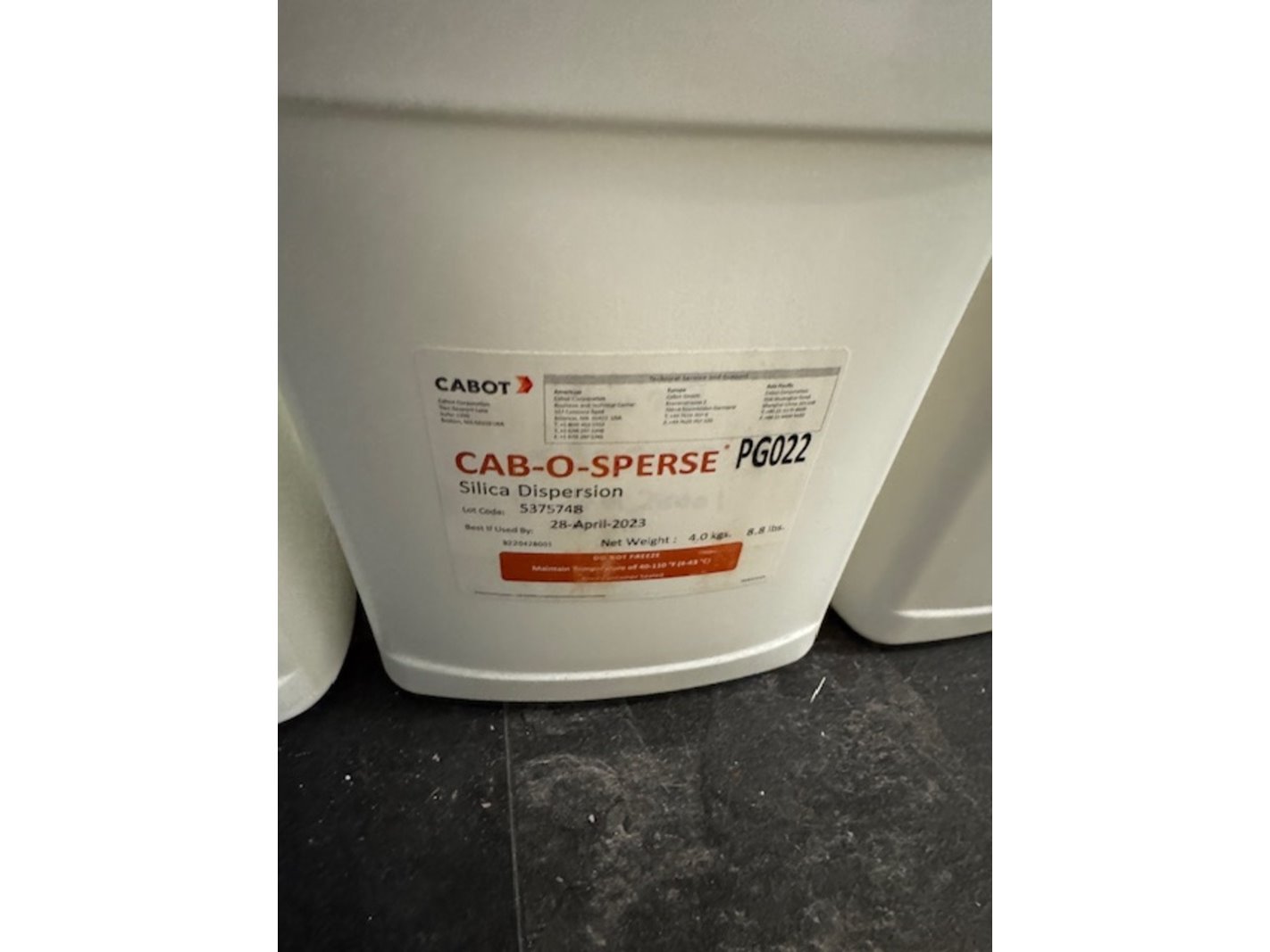 Merk: Cabot Product: silica dispersion Afmeting: 4kg Specificaties: best used by june 2023