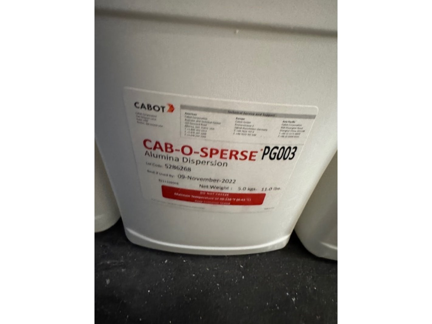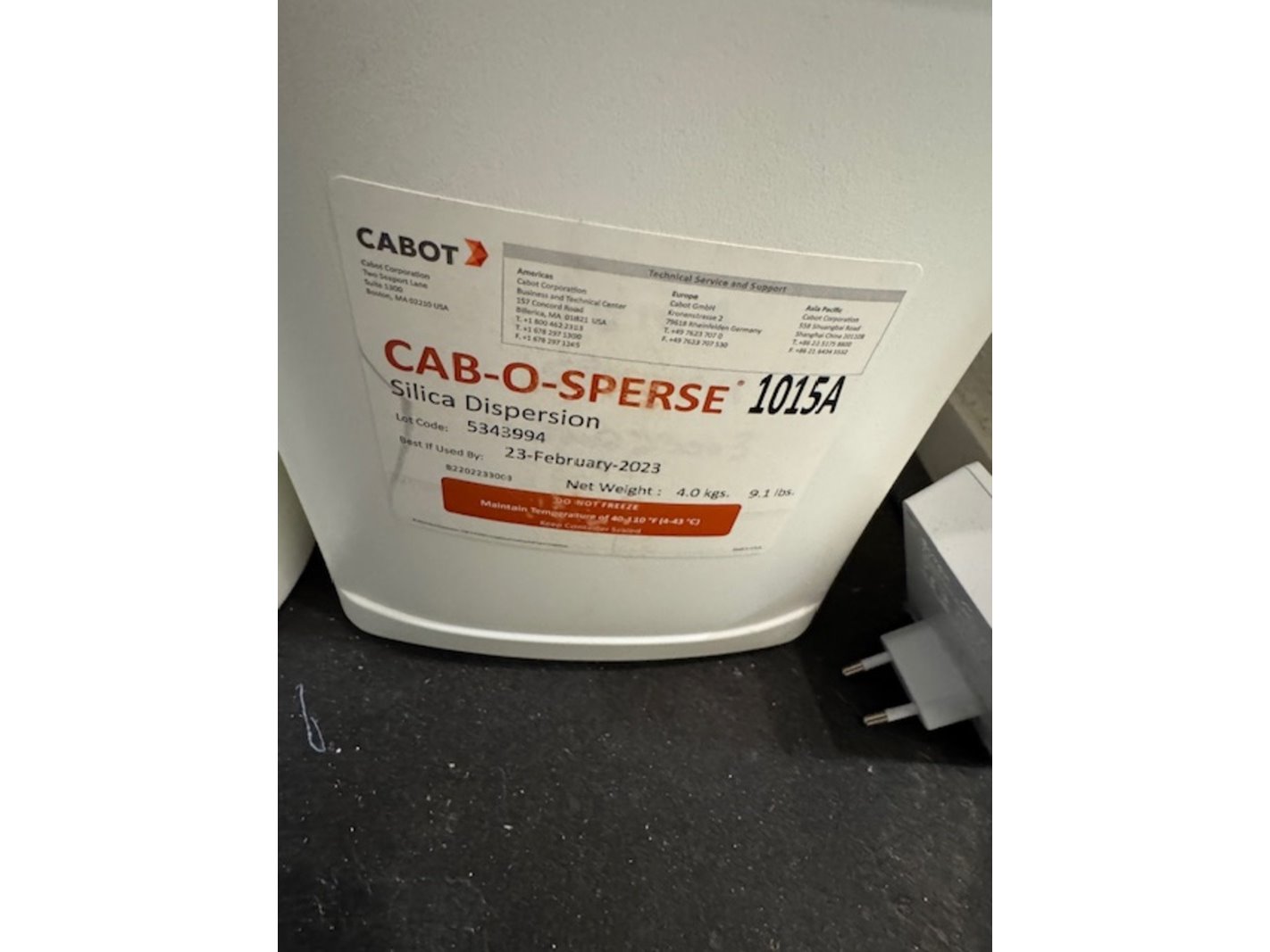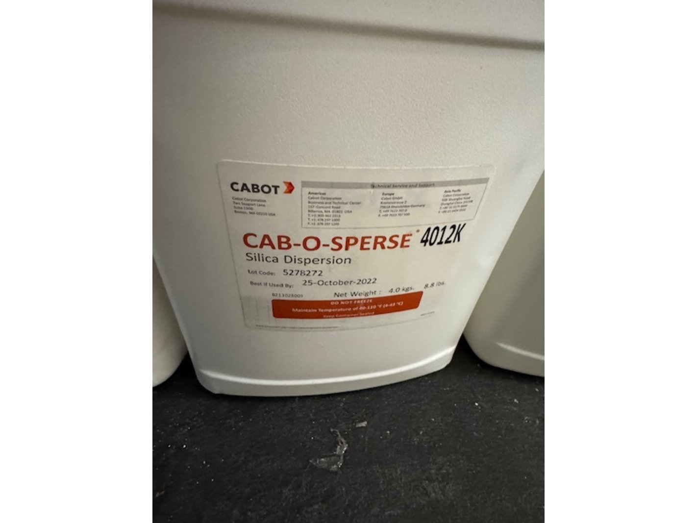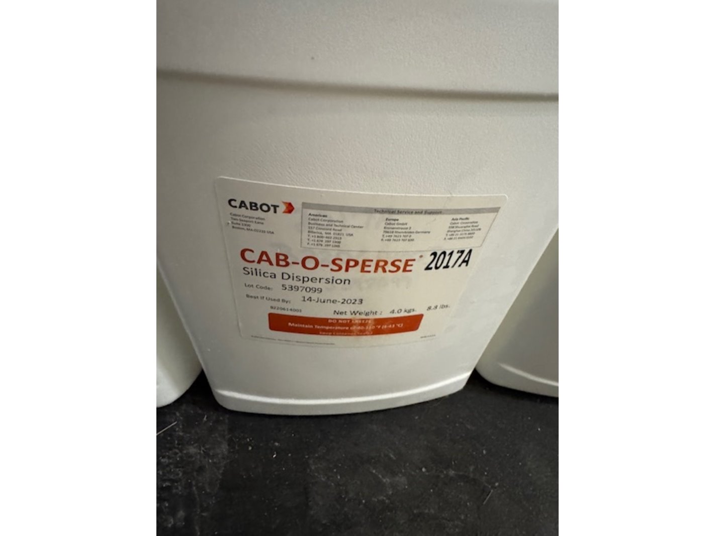 Merk: Cabot Product: silica dispersion Afmeting: 4kg Specificaties: best used by june 2023